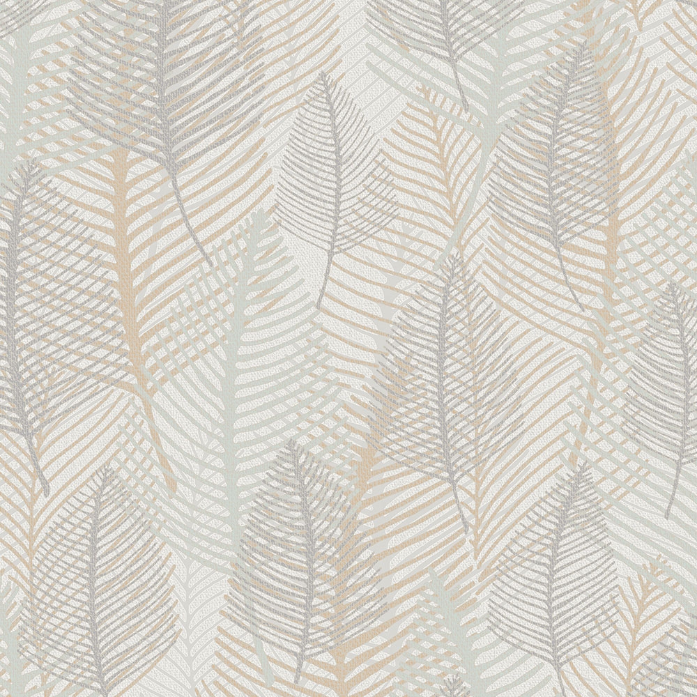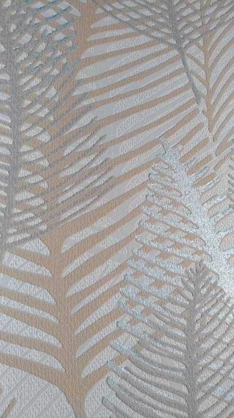 Design of embossed leaves in shades of gray and ocher, leaves in semi-gloss bright turquoise.