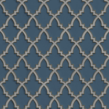 Background blue fabric design with a subtle semi-gloss, embossed geometric ornamental pattern. Silver pattern texture, gold contours with patina.