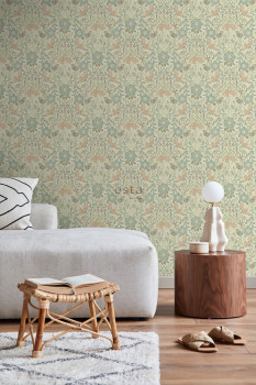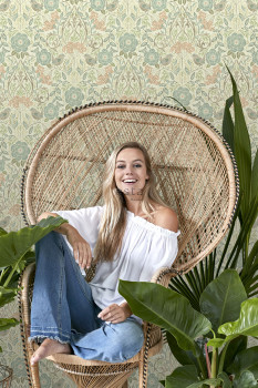Non-woven wallpaper, motifs of flowers, plants and birds in shades of green, gray and beige.