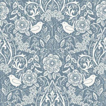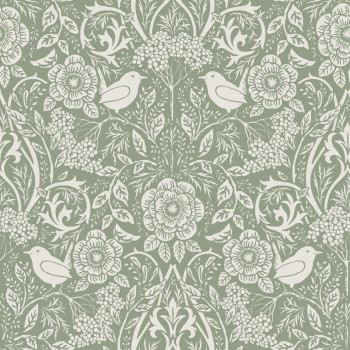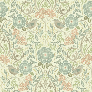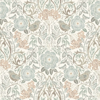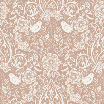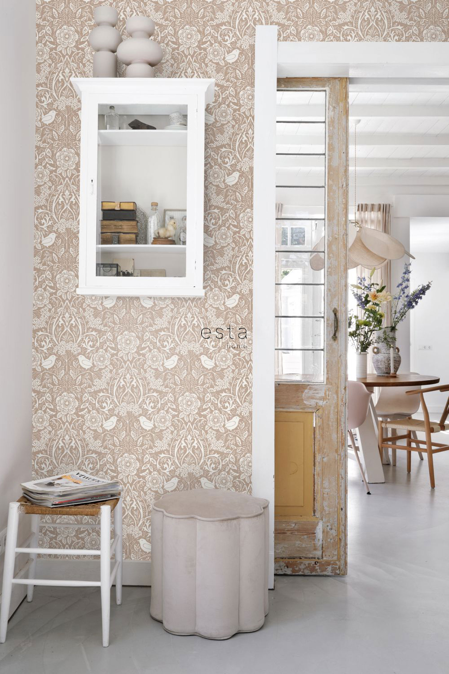 Brown-white non-woven wallpaper, motifs of flowers, plants and birds.