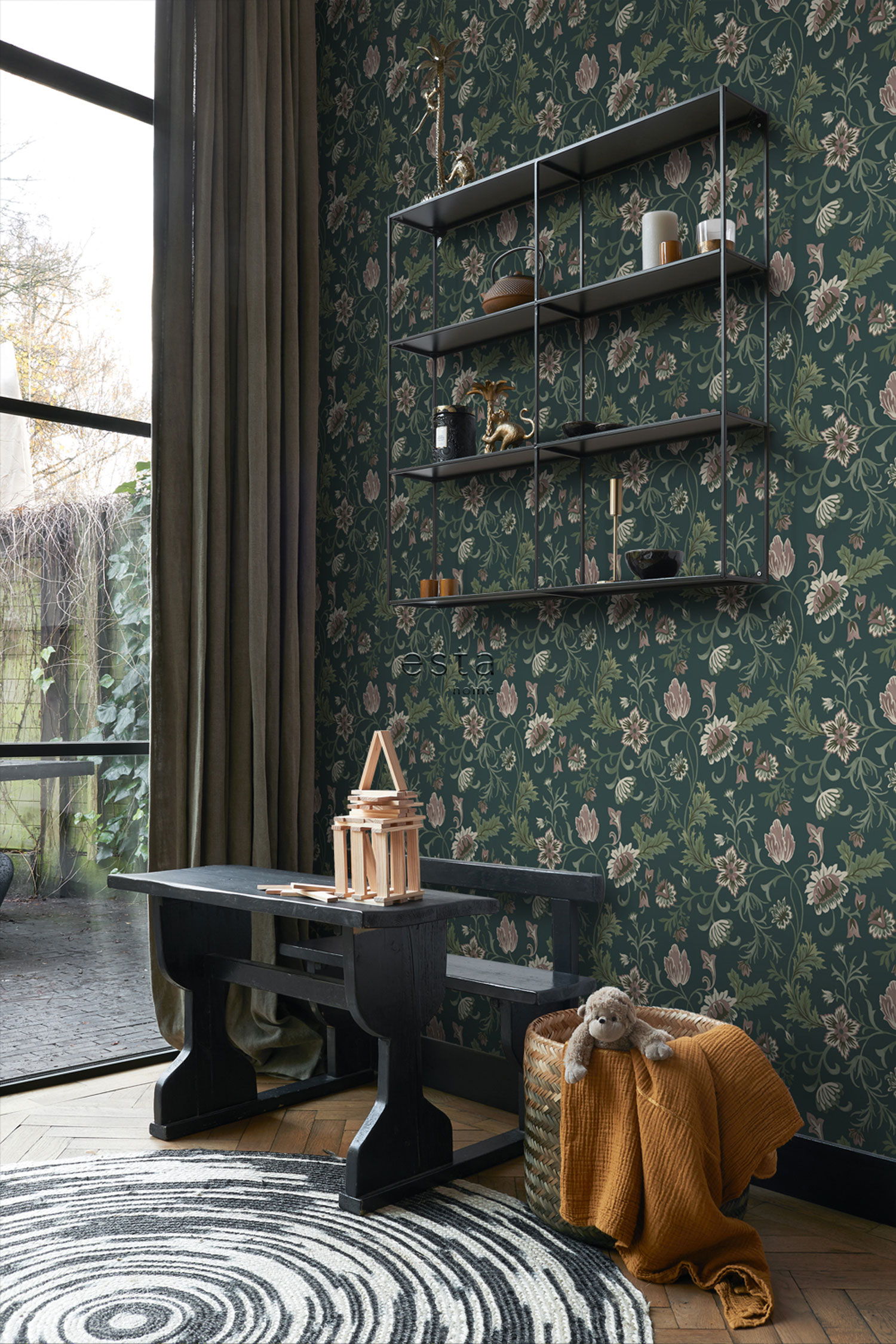 Dark green non-woven wallpaper with floral pattern in shades of green, beige and pink.