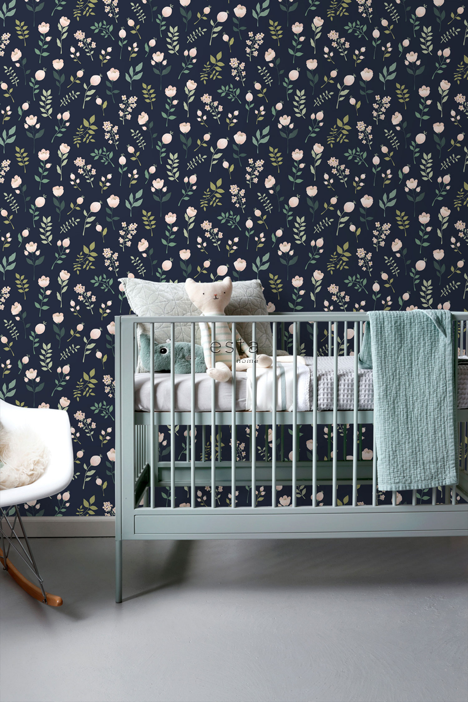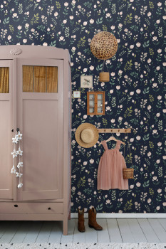 Smooth navy blue non-woven wallpaper, floral pattern in shades of green and pink.