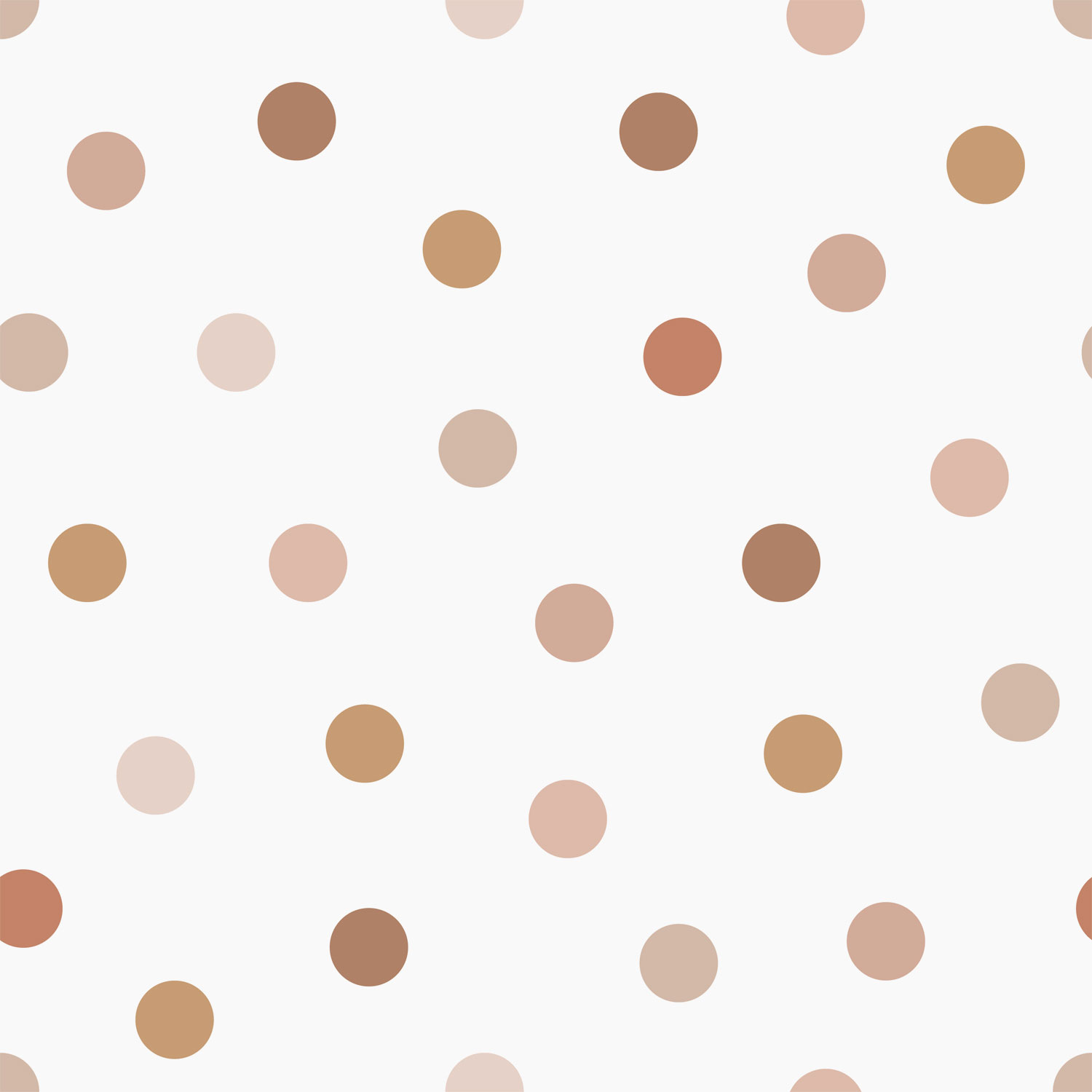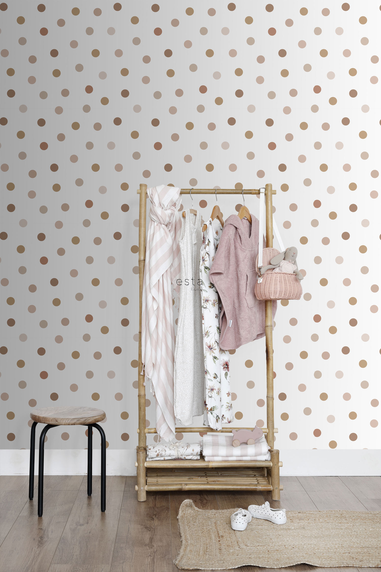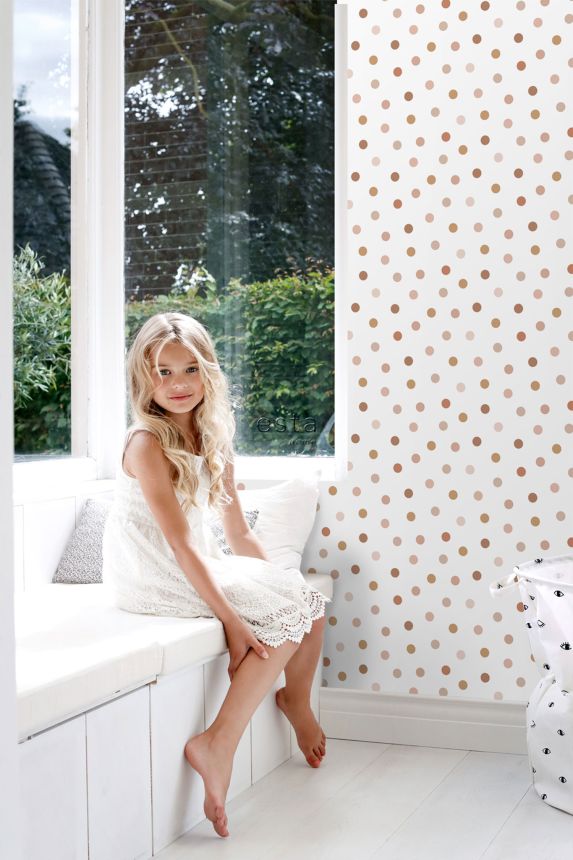 White non-woven wallpaper, dots in shades of brown-pink. Dots approx. 3.7cm.
