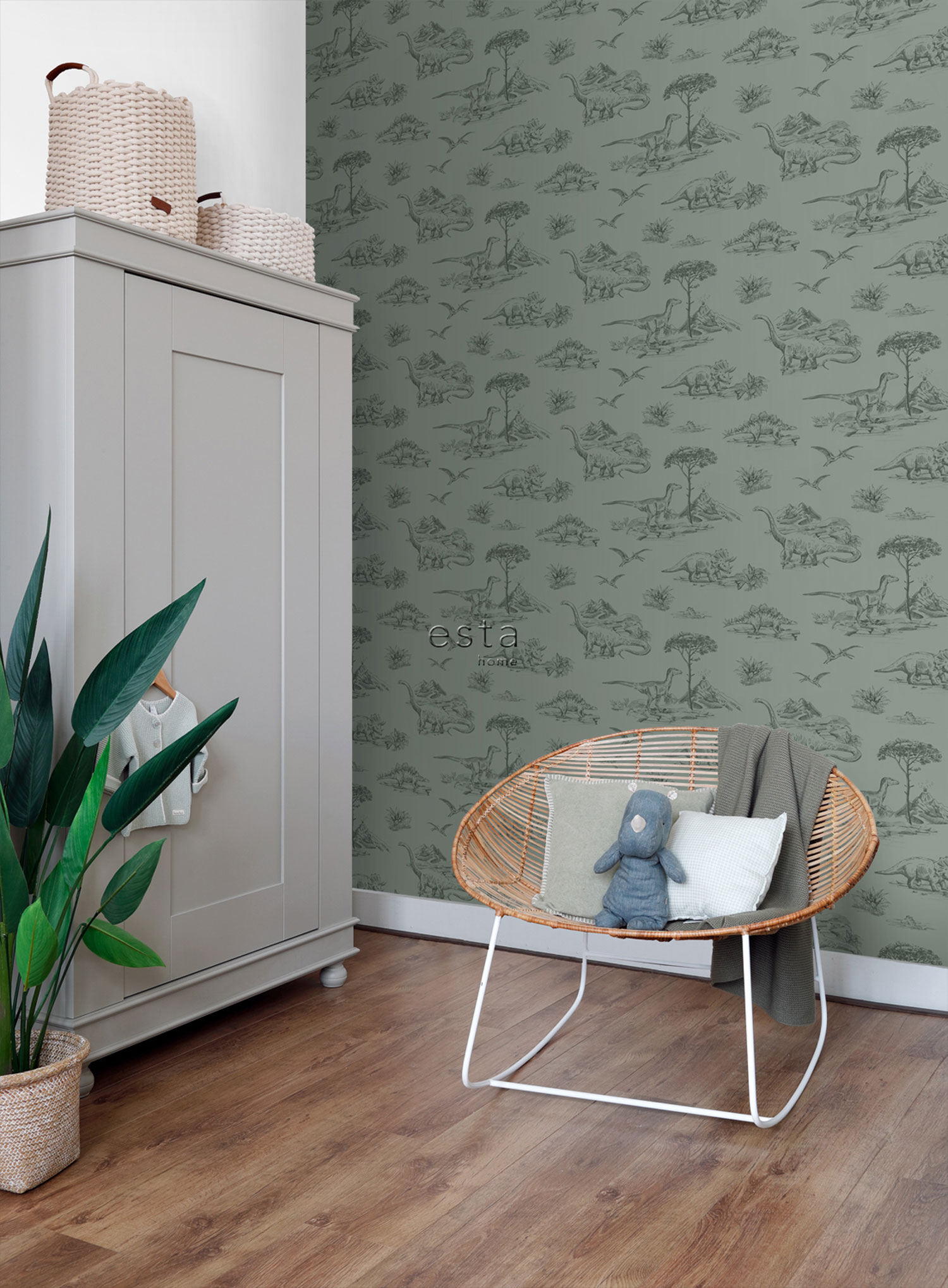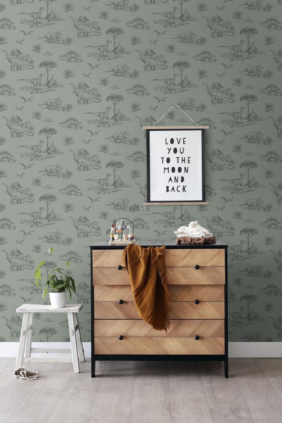 Green children's wallpaper with dinosaurs 139358, To the Moon and Back, Esta Home