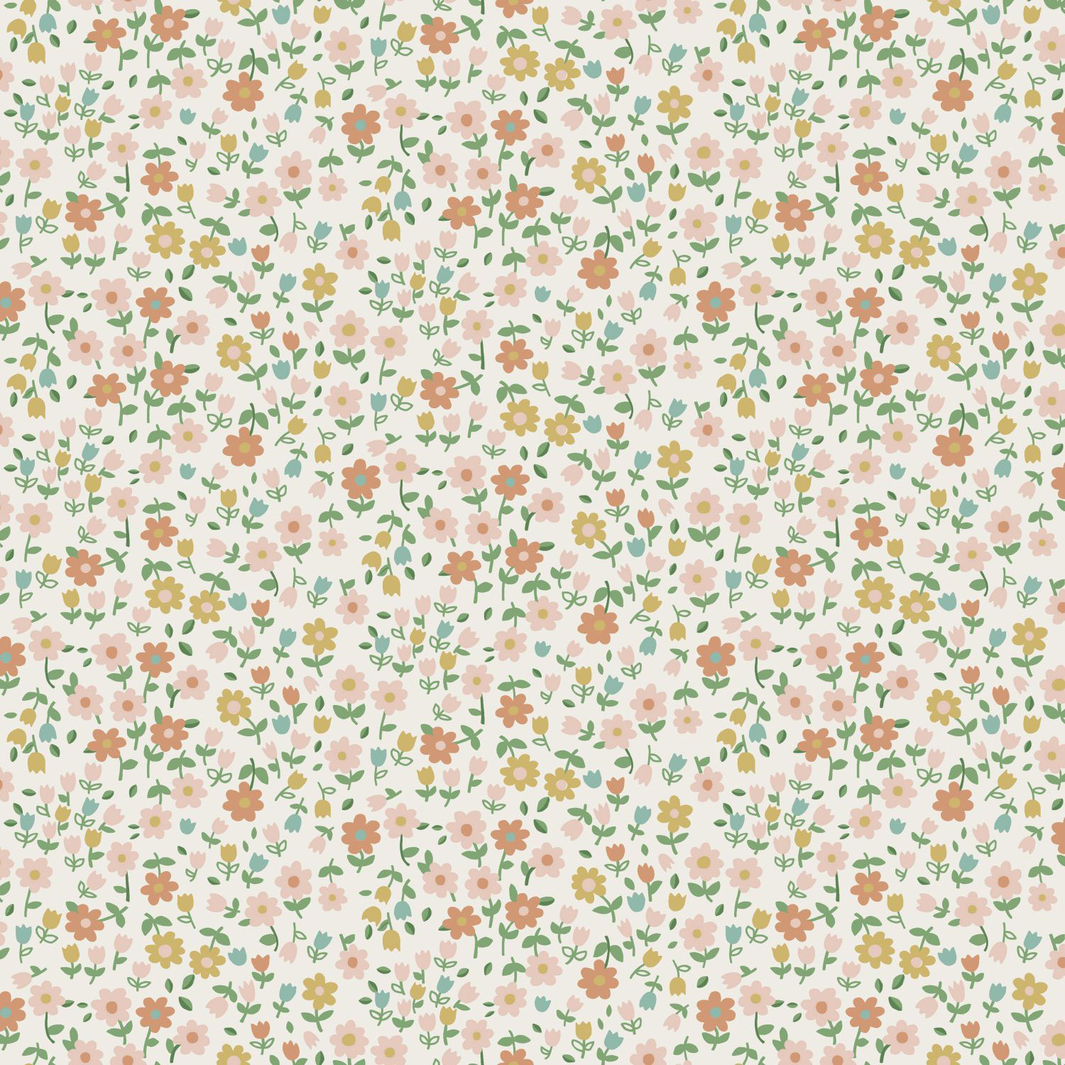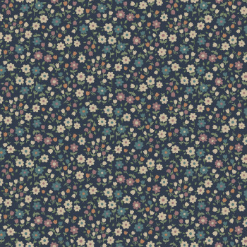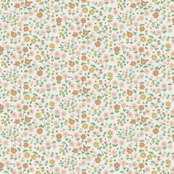 Smooth non-woven wallpaper, floral pattern in shades of green, blue, pink and brown.