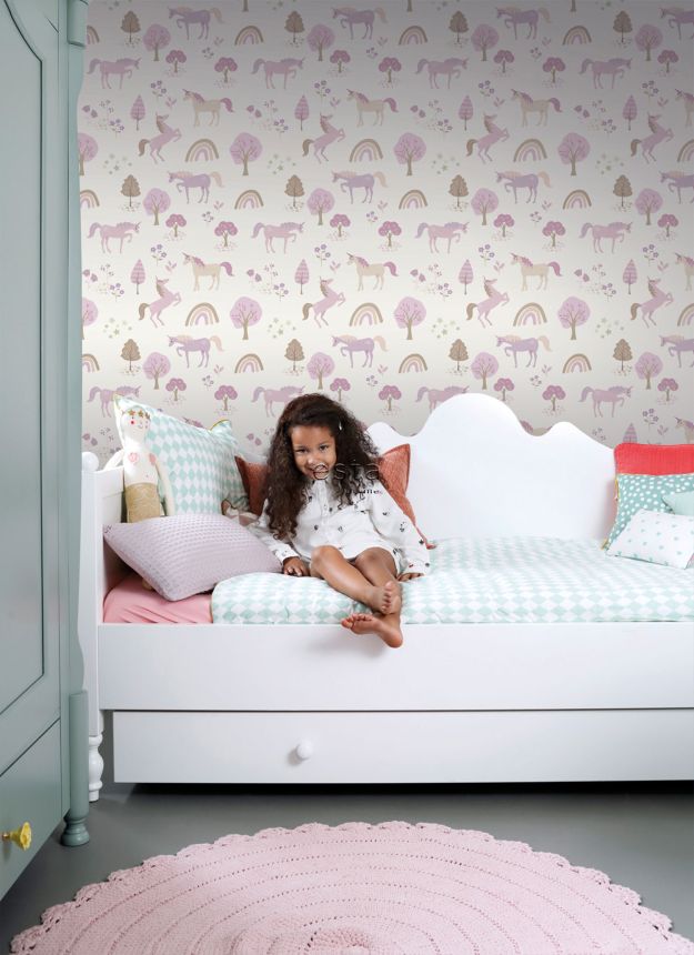Smooth non-woven wallpaper, trees, rainbow, stars and unicorns in shades of lilac, brown and beige.