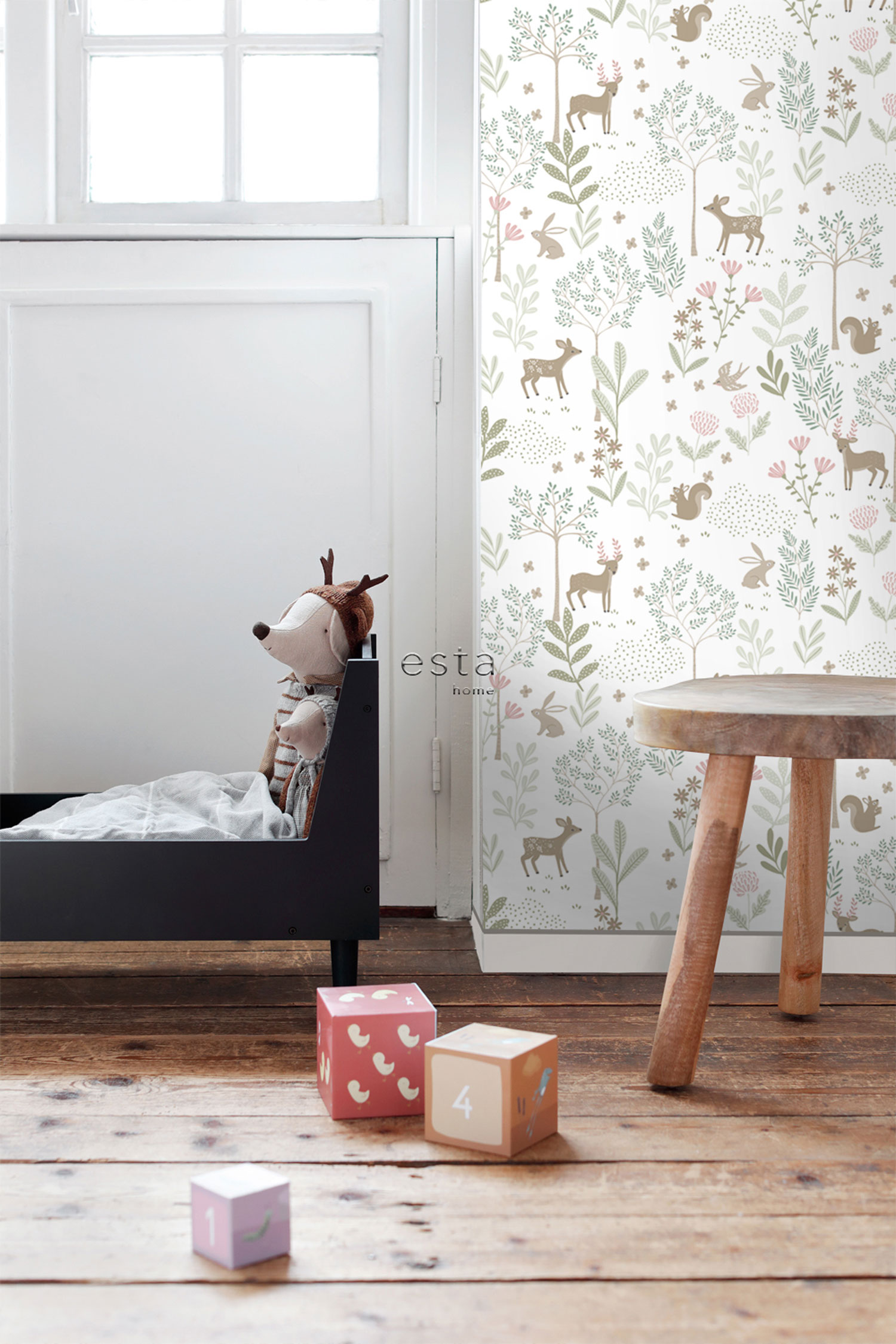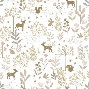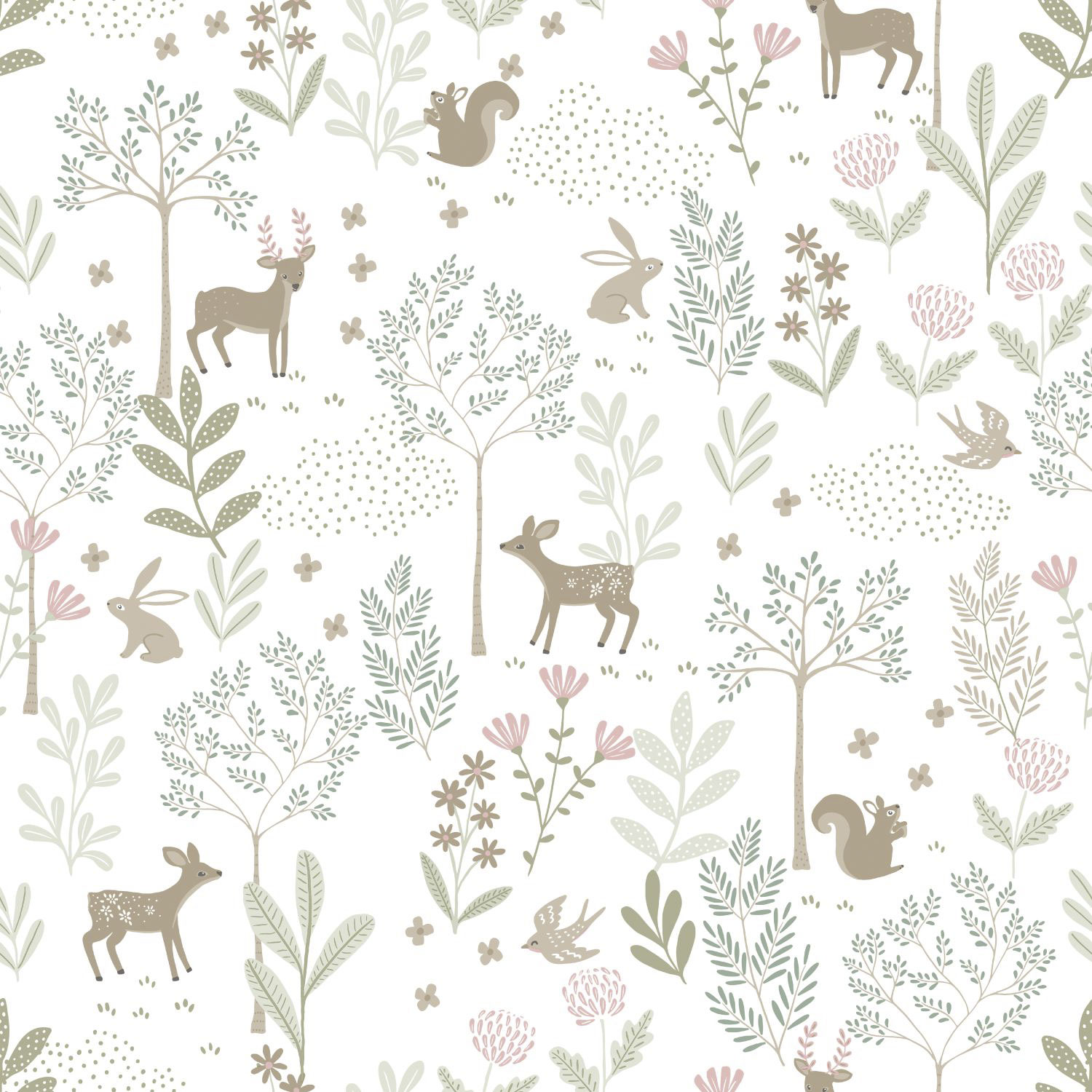 Smooth white non-woven wallpaper, children's patterns of nature and animals in shades of brown, green and pink.
