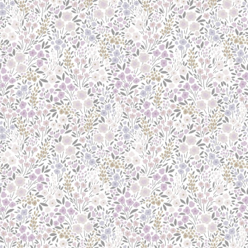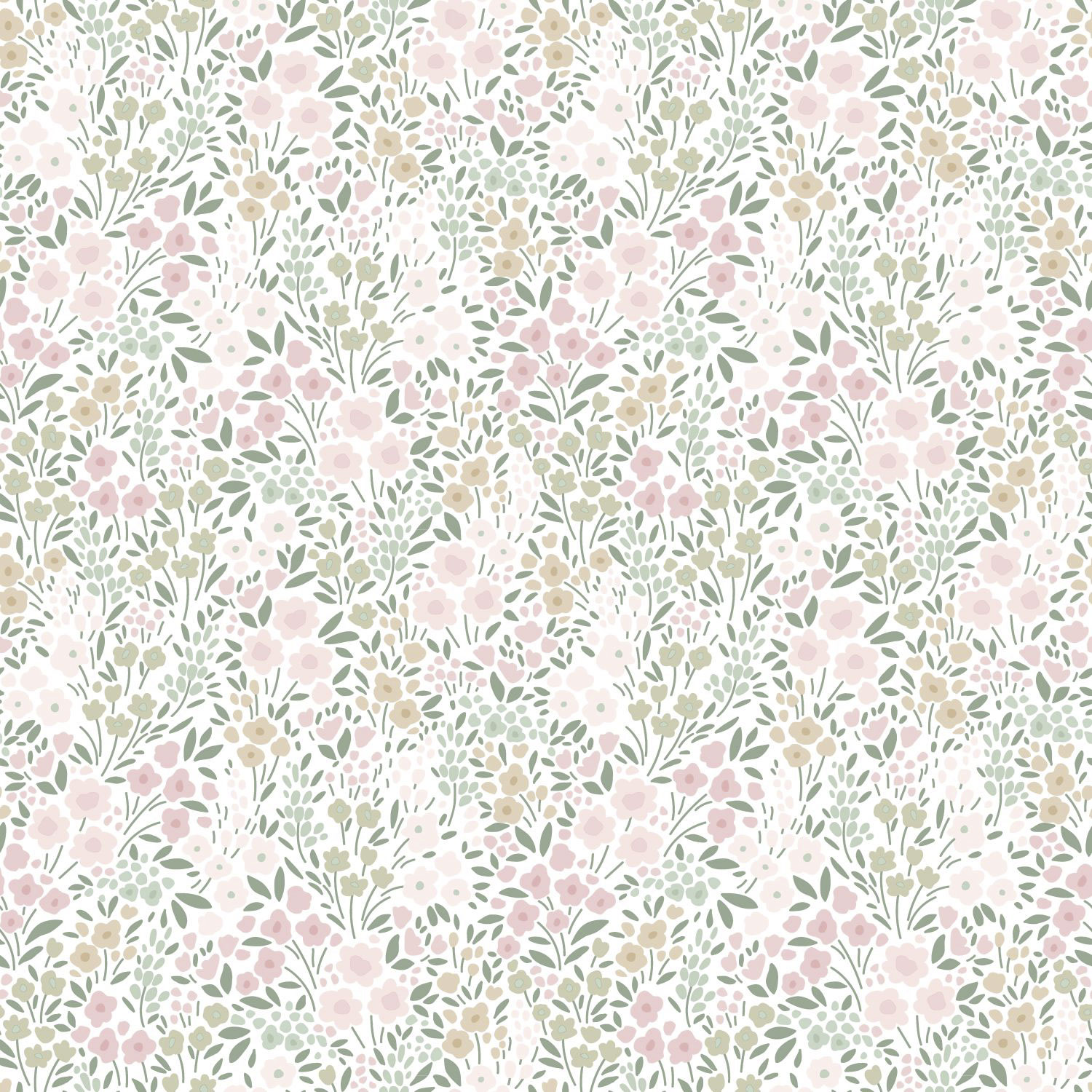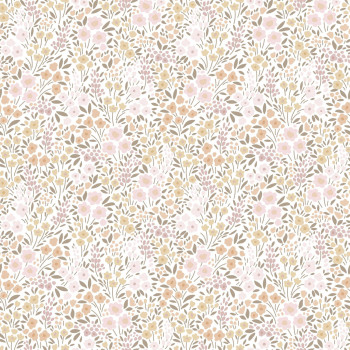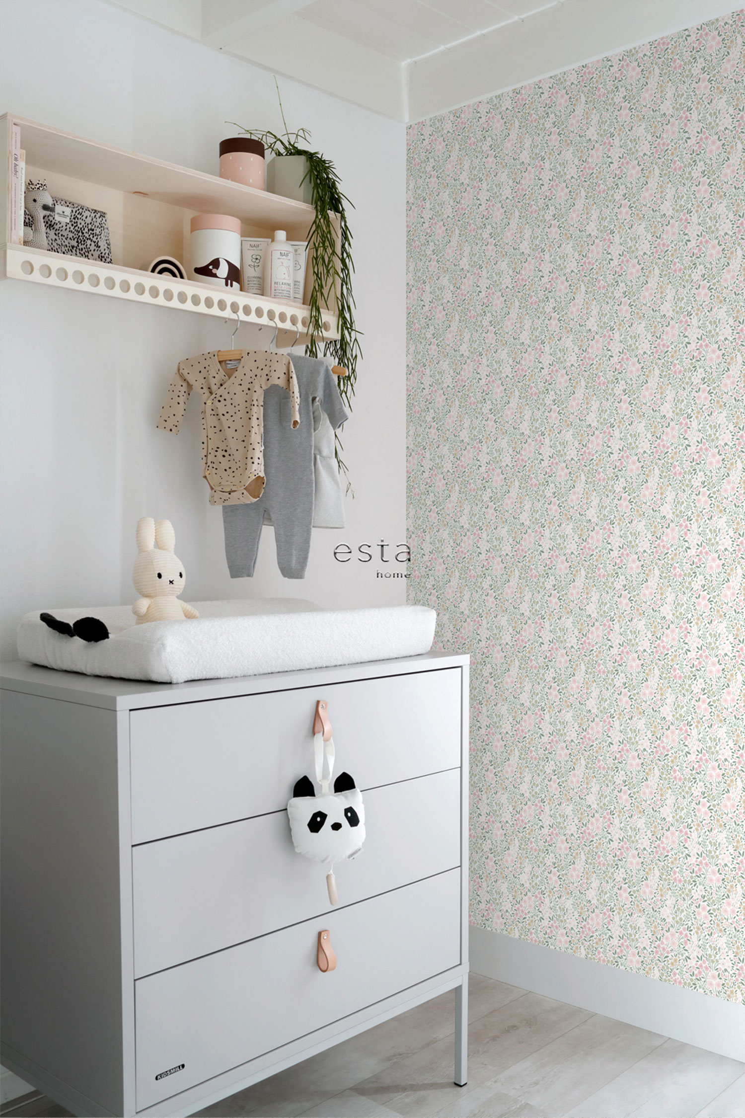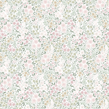 Smooth non-woven wallpaper, floral pattern in pastel shades of green, turquoise, pink and beige.
