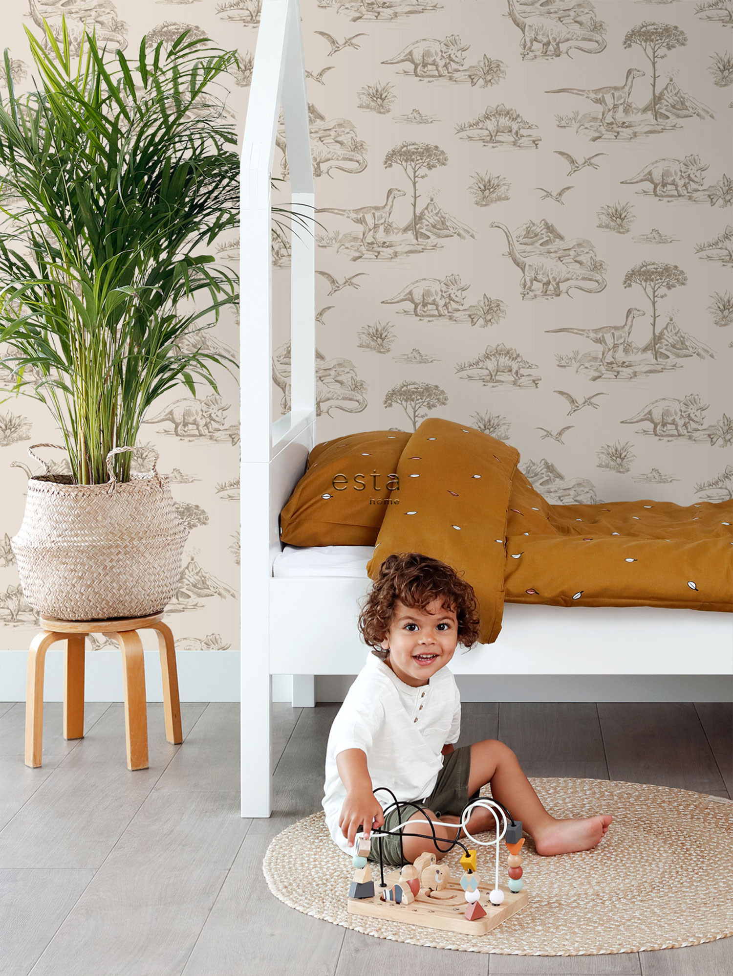 Beige non-woven wallpaper with dinosaurs 139557, To the Moon and Back, Esta Home