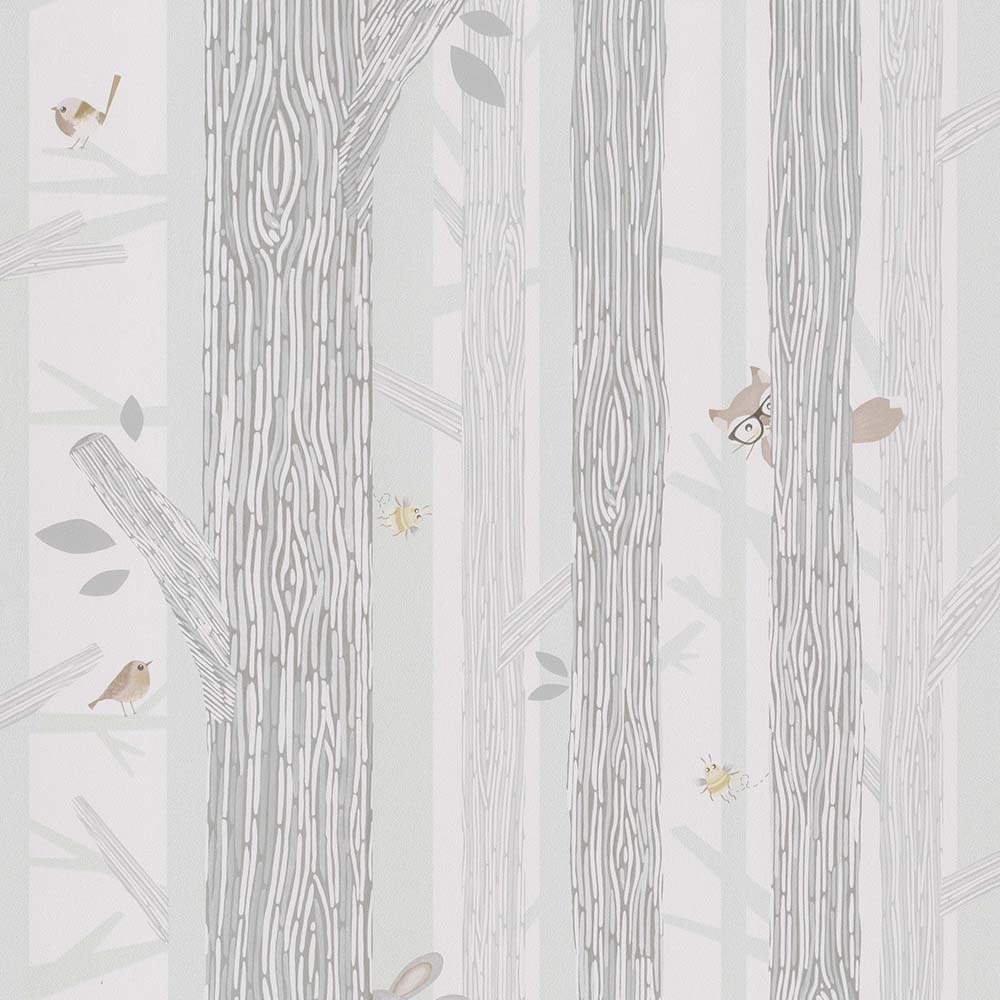 Animals, birds and bees in a forest. Gray-white shades, semi-glossy green, animals in gray, brown and yellow colors on a non-woven wallpaper.