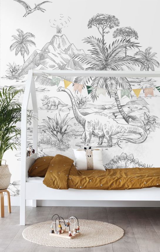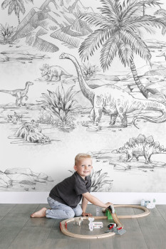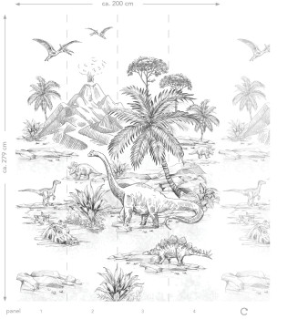 Black-white non-woven wall mural with dinosaurs. The wallpaper has a continuous pattern, for a larger width you just need to buy another piece. 4 parts 50x279cm