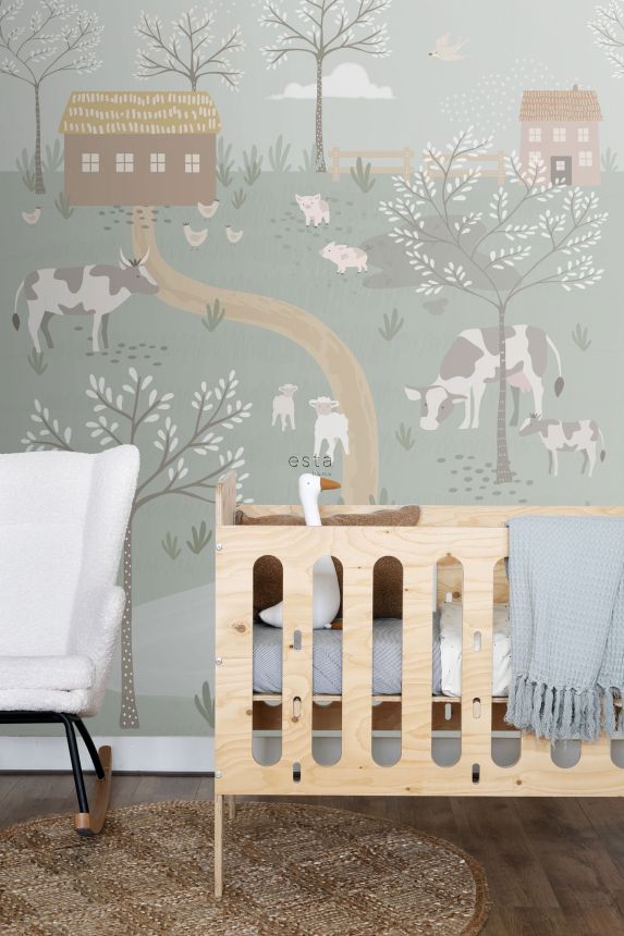 Non-woven wall mural with farm animals. The wallpaper has a continuous pattern, for a larger width you just need to buy another piece. 4 parts 50x279cm