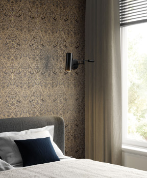 Finely textured black non-woven wallpaper - baroque damask pattern with semi-gloss bronze outlines.