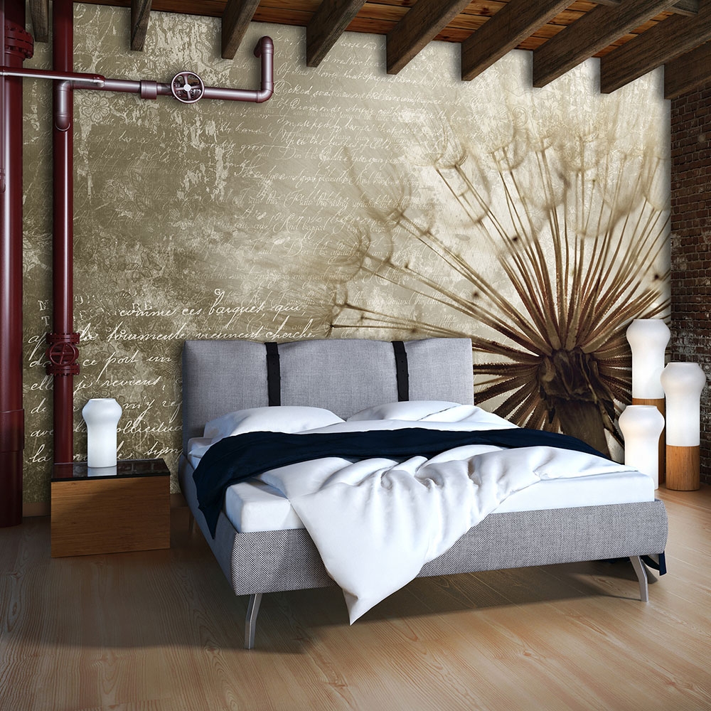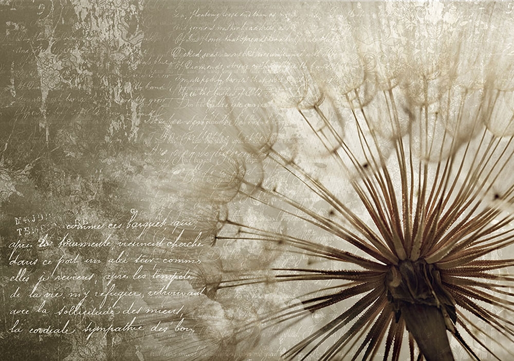 Bring romance and elegance into your interior ... overblown dandelion with a handwritten French text. 4-pieces non woven mural wallpaper.