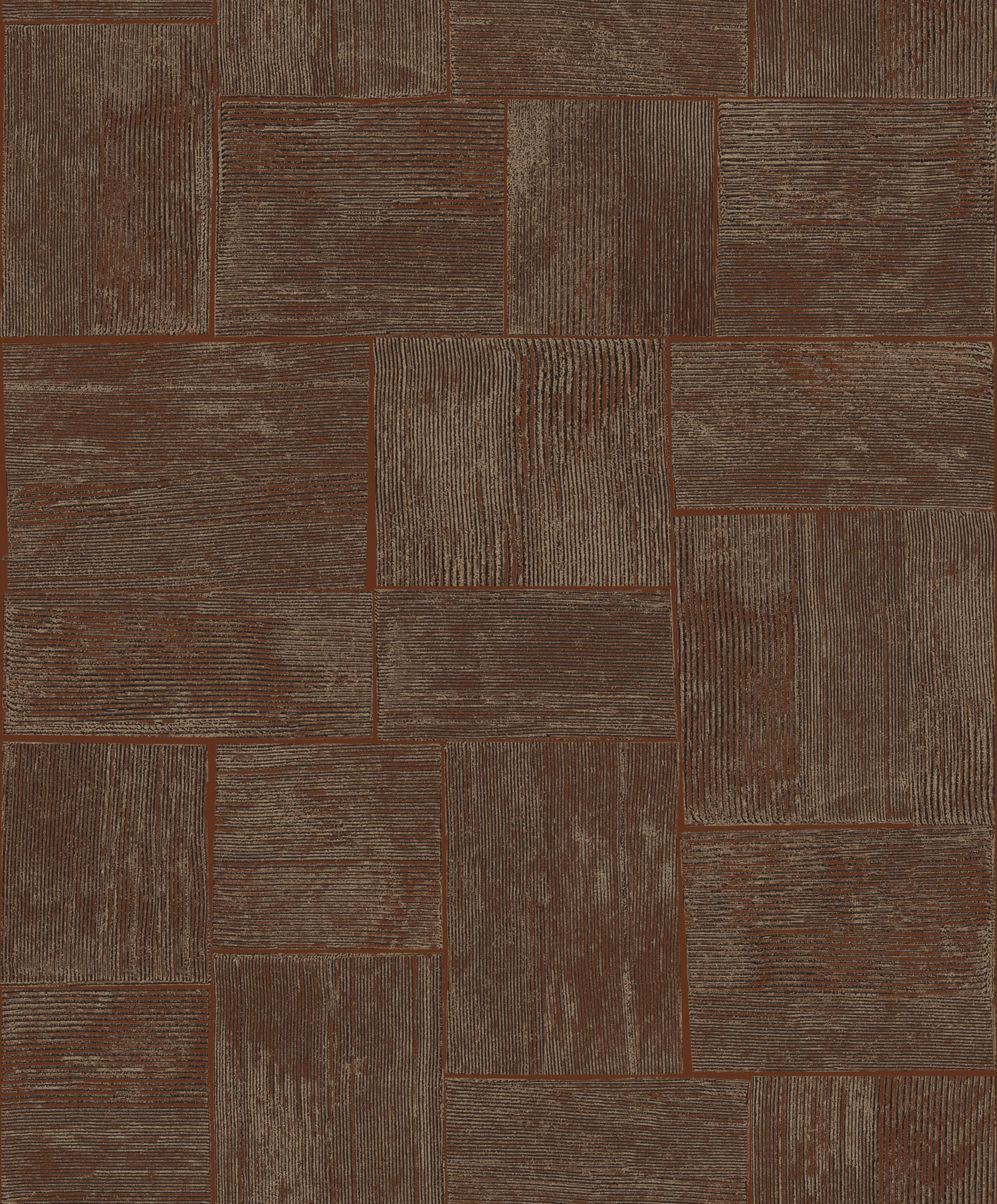 Geometric non-woven wallpaper, pattern formed by embossed lines, shades of brown, burgundy and terra, in places a subtle golden semi-gloss.