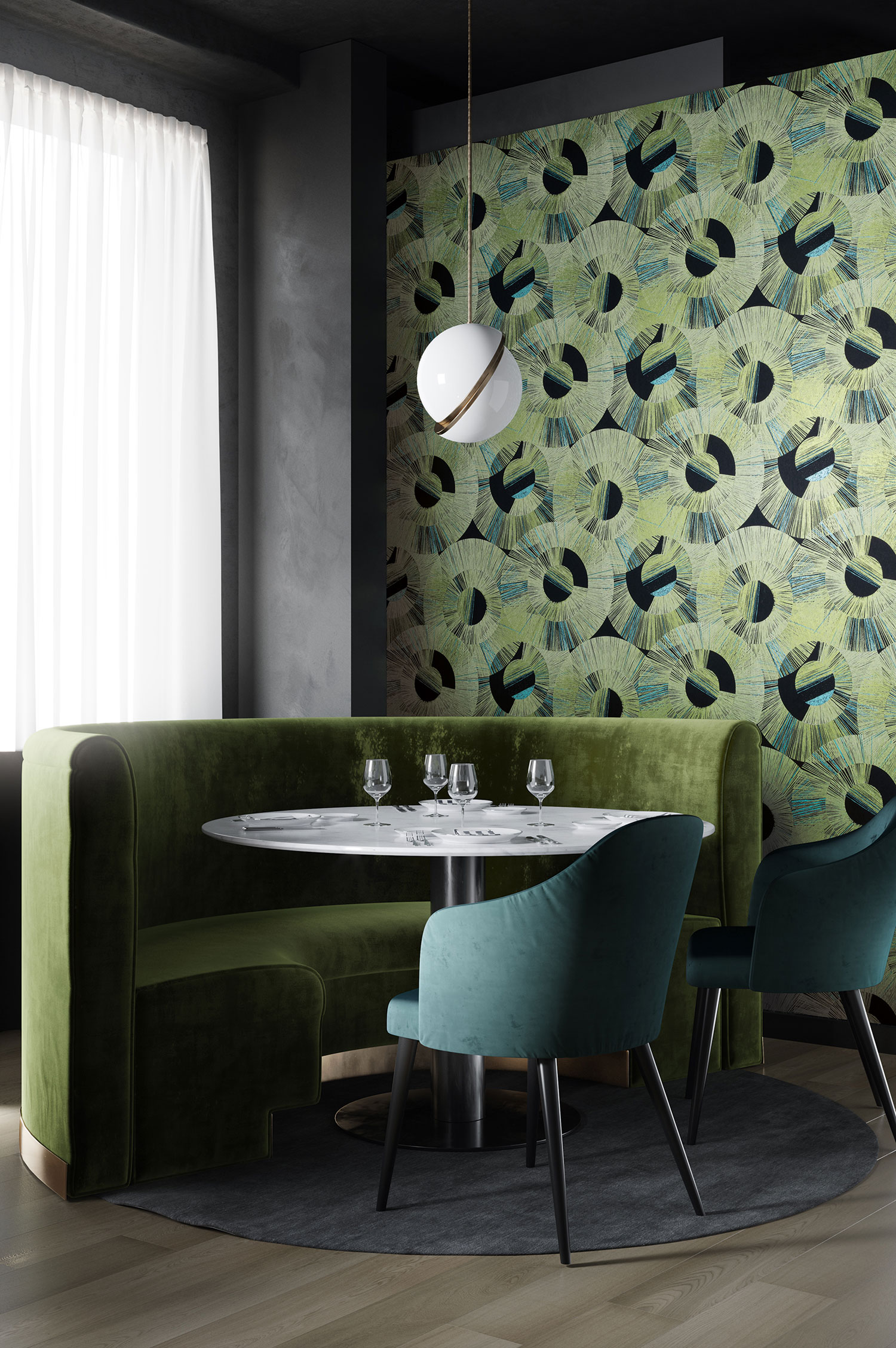 Luxury non-woven wallpaper, geometric circular pattern, shades of green and black, metallic details.