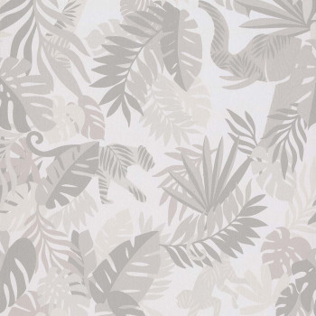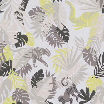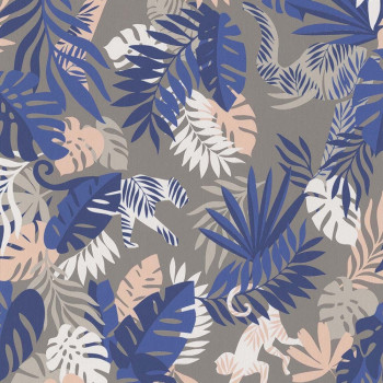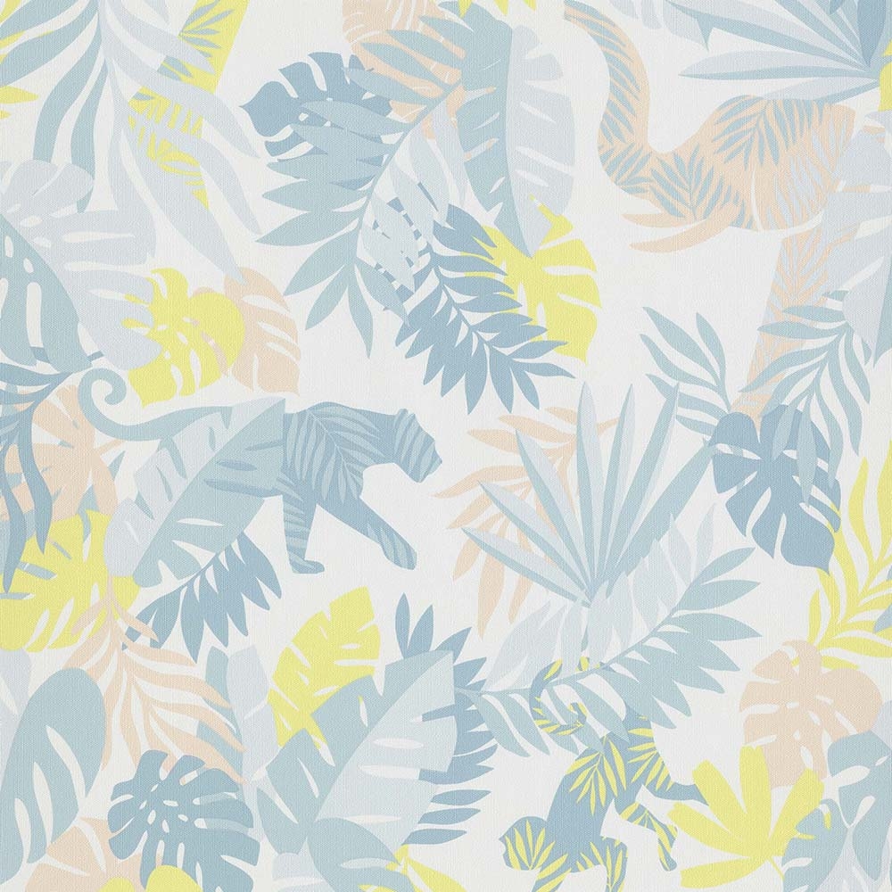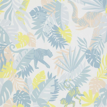 Children's wallpaper with a jungle motif - tropical leaves, elephants, tigers, giraffes, monkeys ... in blue, turquoise, salmon and yellow shades. Non-woven washable wallpaper with a fine fabric structure.