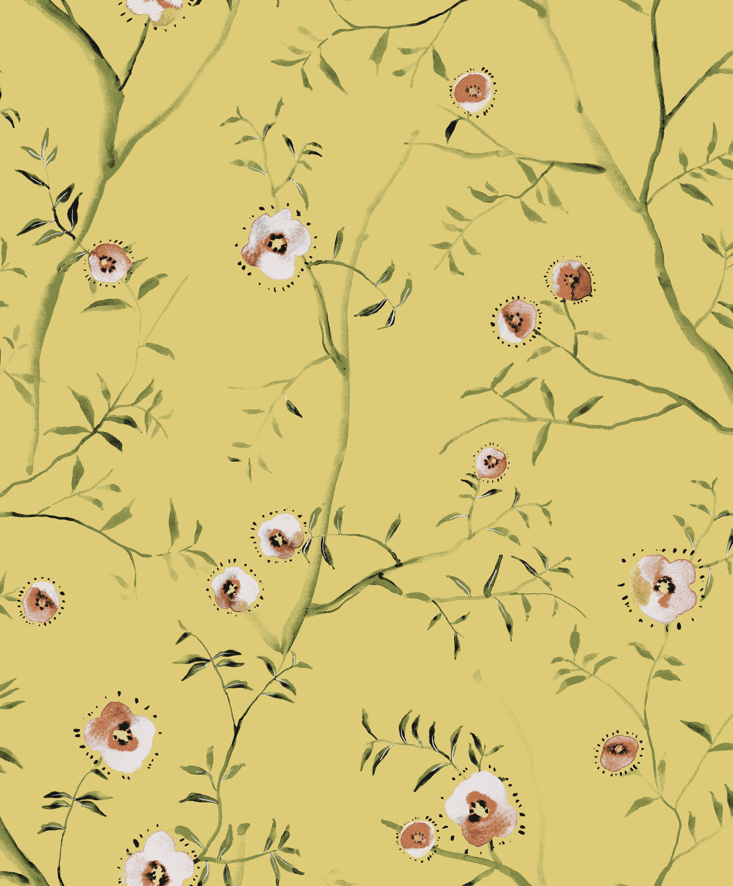Smooth ocher non-woven wallpaper, blossoming twigs in shades of green and white with bronze details.