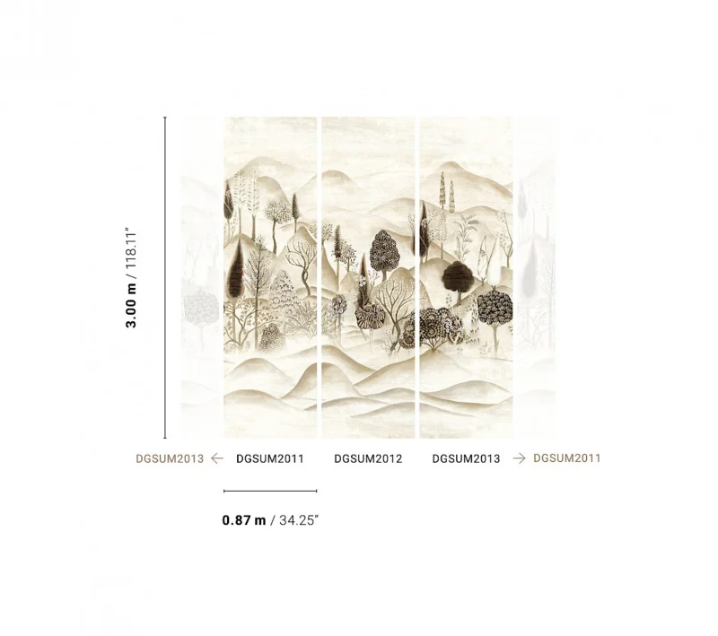 Non-woven wall mural, motif of nature, trees, landscape. Coarse fabric texture. For greater width can be combined with wallpaper DGSUM2012 and DGSUM2013 - see photo. Interior photo is for illustration only