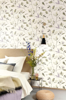 Creamy white smooth non-woven wallpaper, floral magnolia pattern in shades of lilac, green and grey.