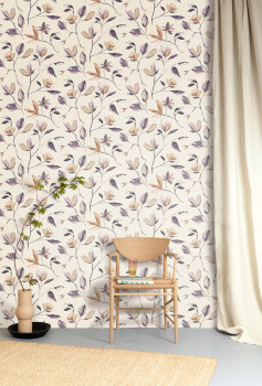 Creamy white smooth non-woven wallpaper, magnolia floral pattern in shades of purple and brown.