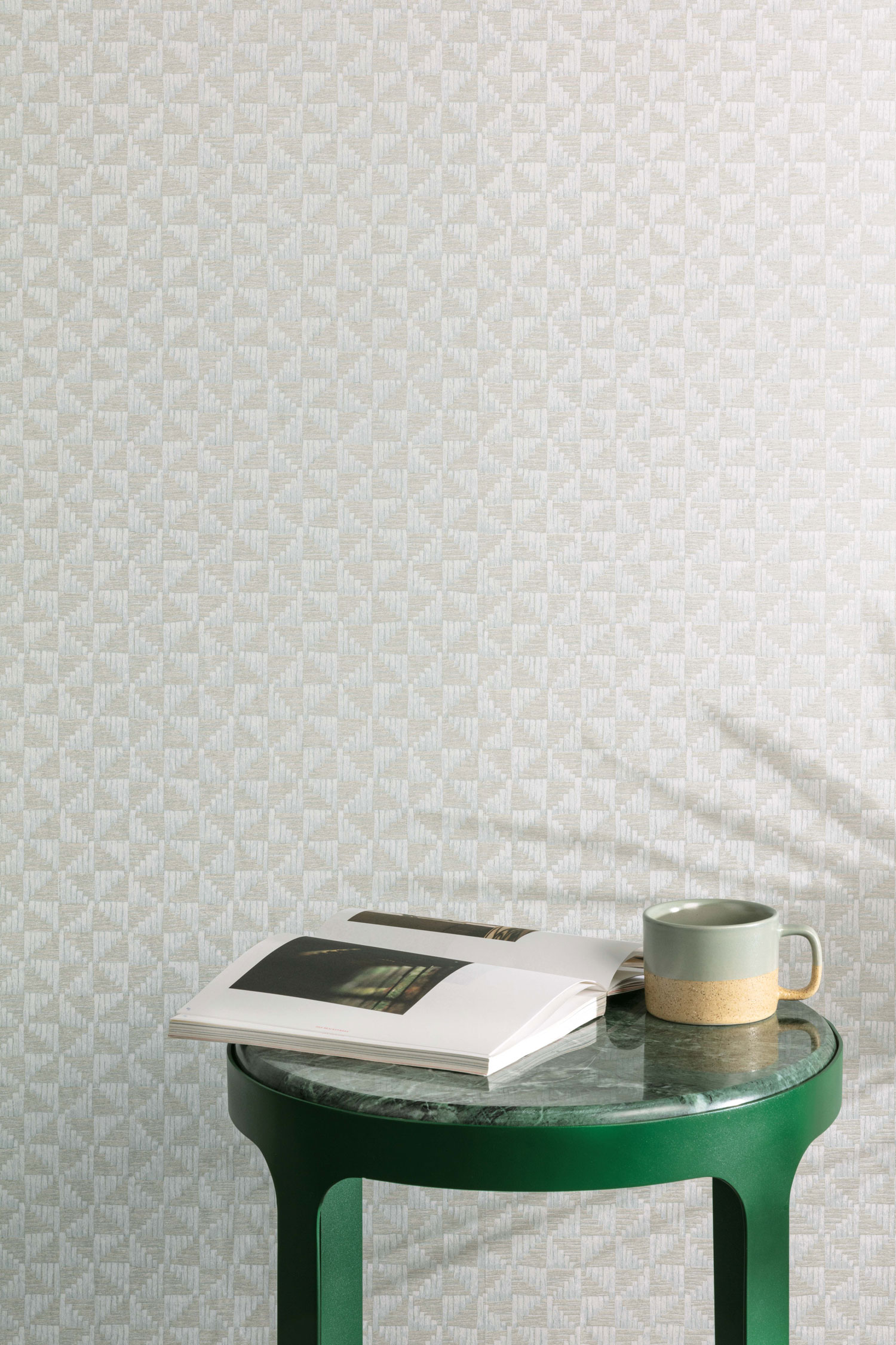 Non-woven wallpaper, geometric patterns inspired by natural materials in shades of cream, beige and blue.
