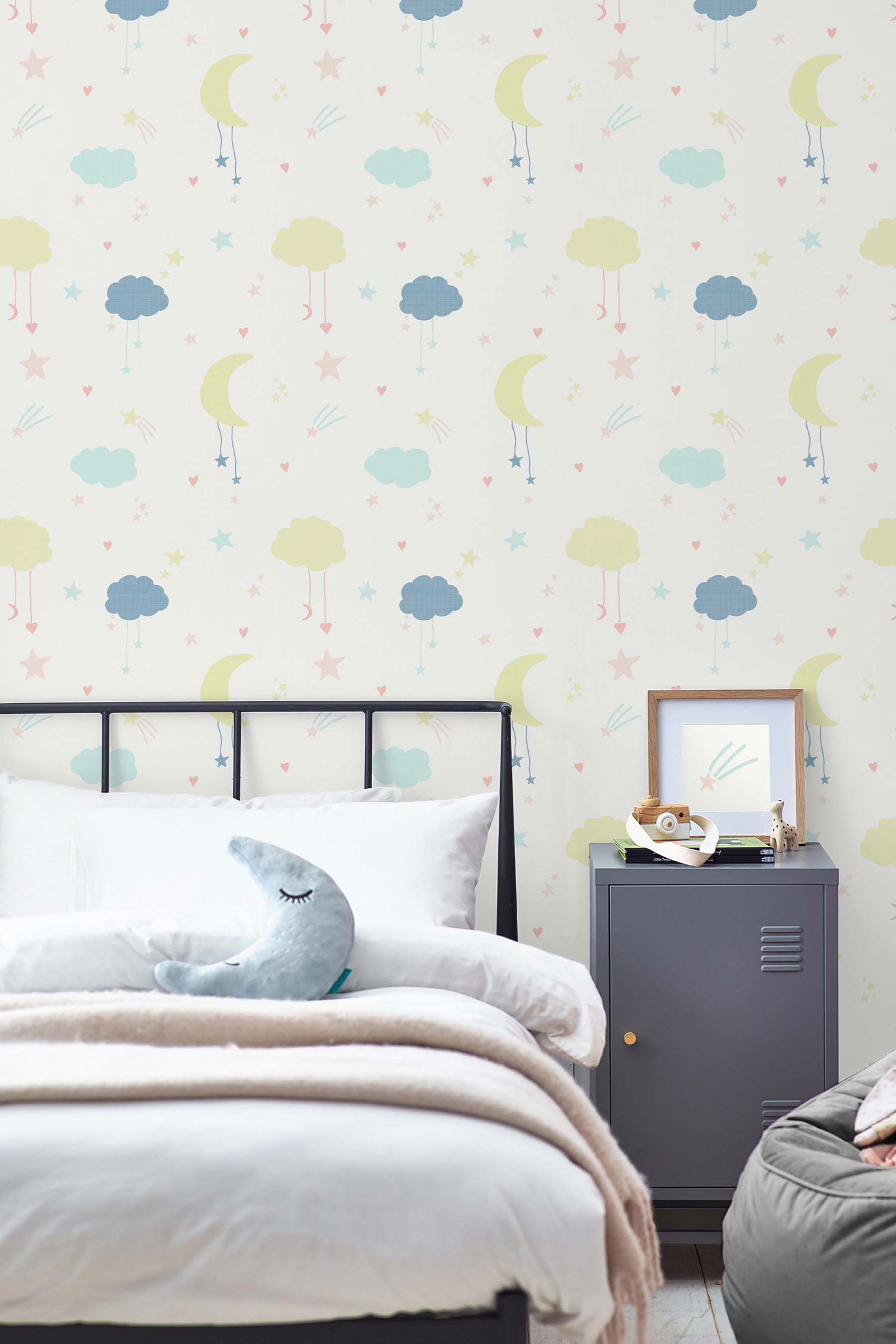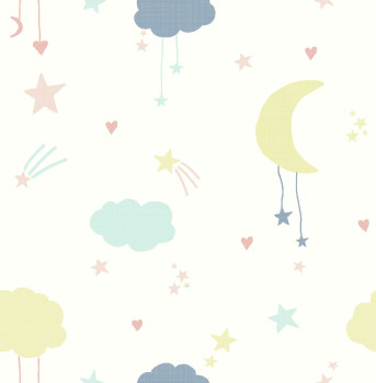 White non-woven wallpaper, children's motifs of clouds and stars in pastel yellow, blue and pink. This charming wallpaper design is perfect to create a calming and sleepy atmosphere for your little one. This gorgeous children’s design features clouds, moons and stars. Printed on a matt paper for a modern feel, this wallpaper is also paste the wall making it easy to hang.