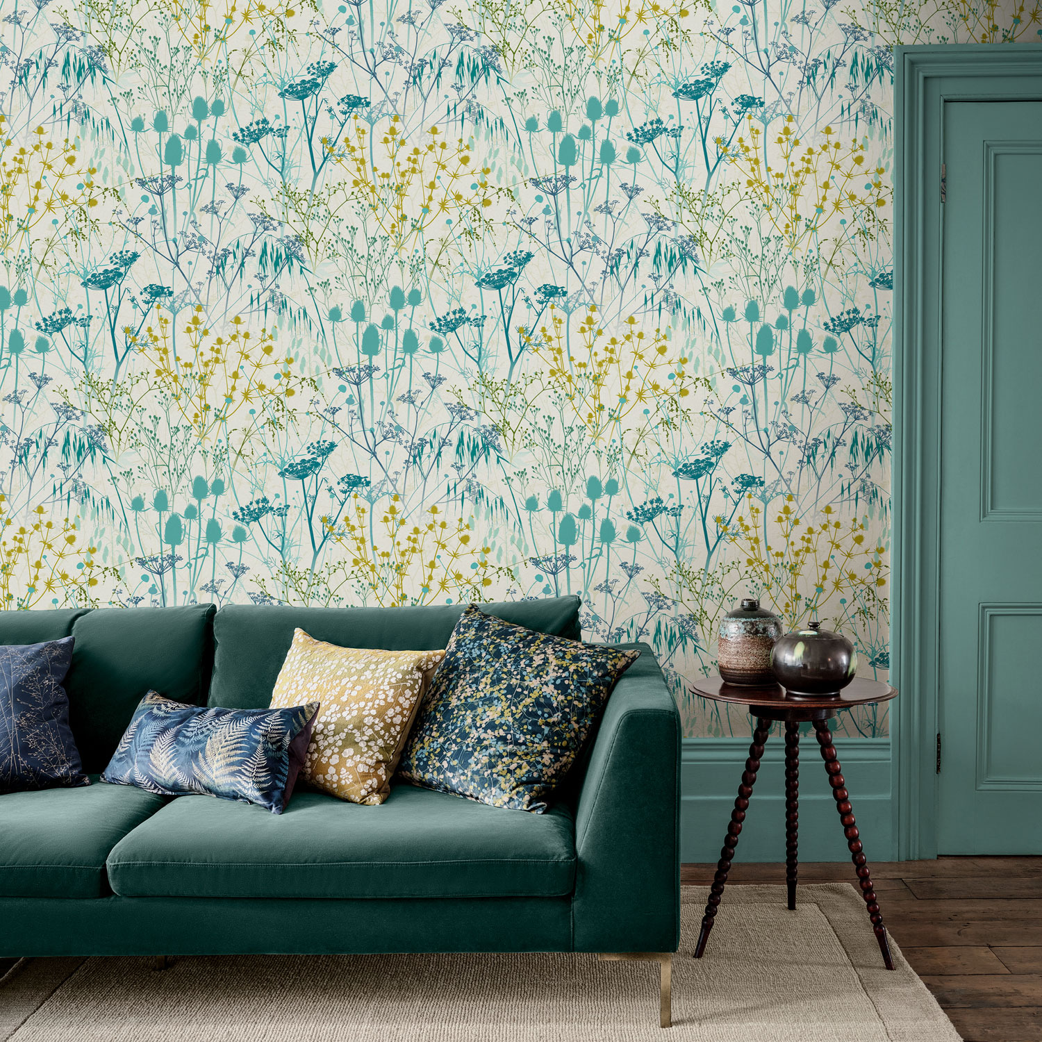 Grey non-woven wallpaper, motif of meadow grass in shades of green, turquoise and yellow.   Seen here is the new Summer Border design which is a portrait of a meadow wilderness, in luminous teal, turquoise and chartreuse palette. The design was inspired by one of Clarissa's fauourite haunts; a magical garden belonging to her friend and renowned garden designer Tania Compton. The abundant tangle of grasses, teasels, dill seeds heads and uerbena capture essence of wild and natural beauty.