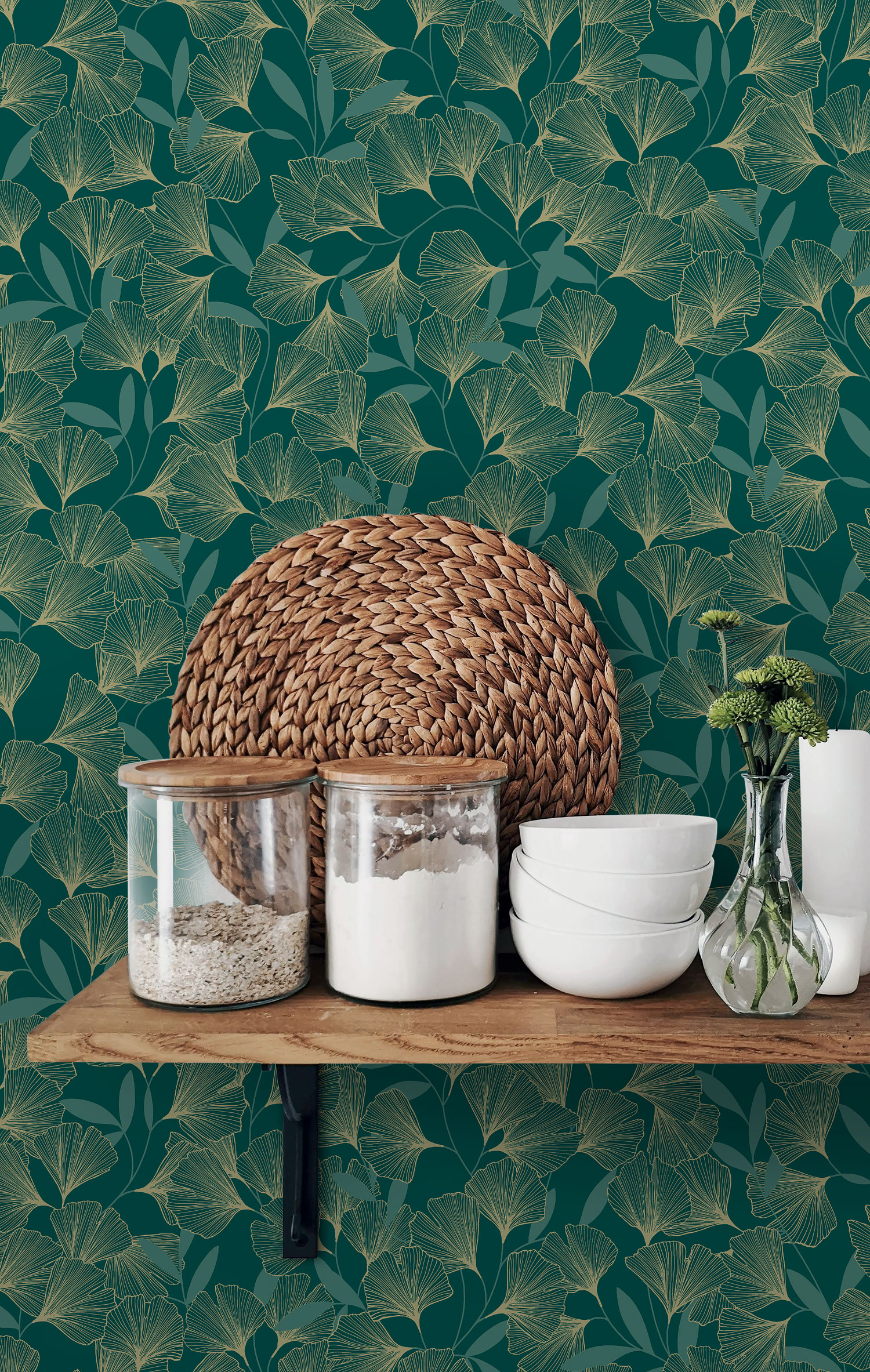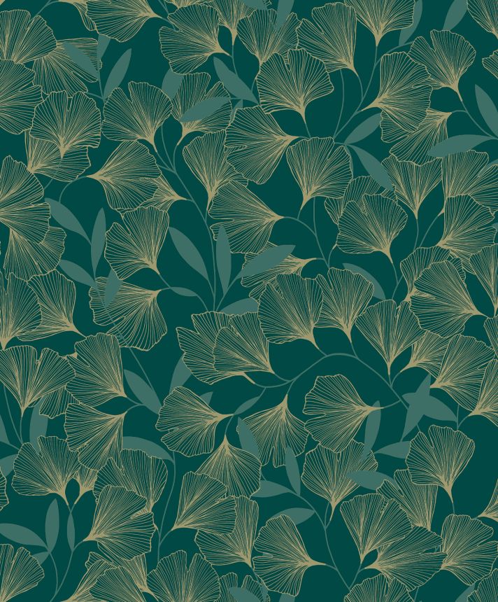 Green non-woven wallpaper with vinyl surface, motifs of golden Ginkgo leaves.