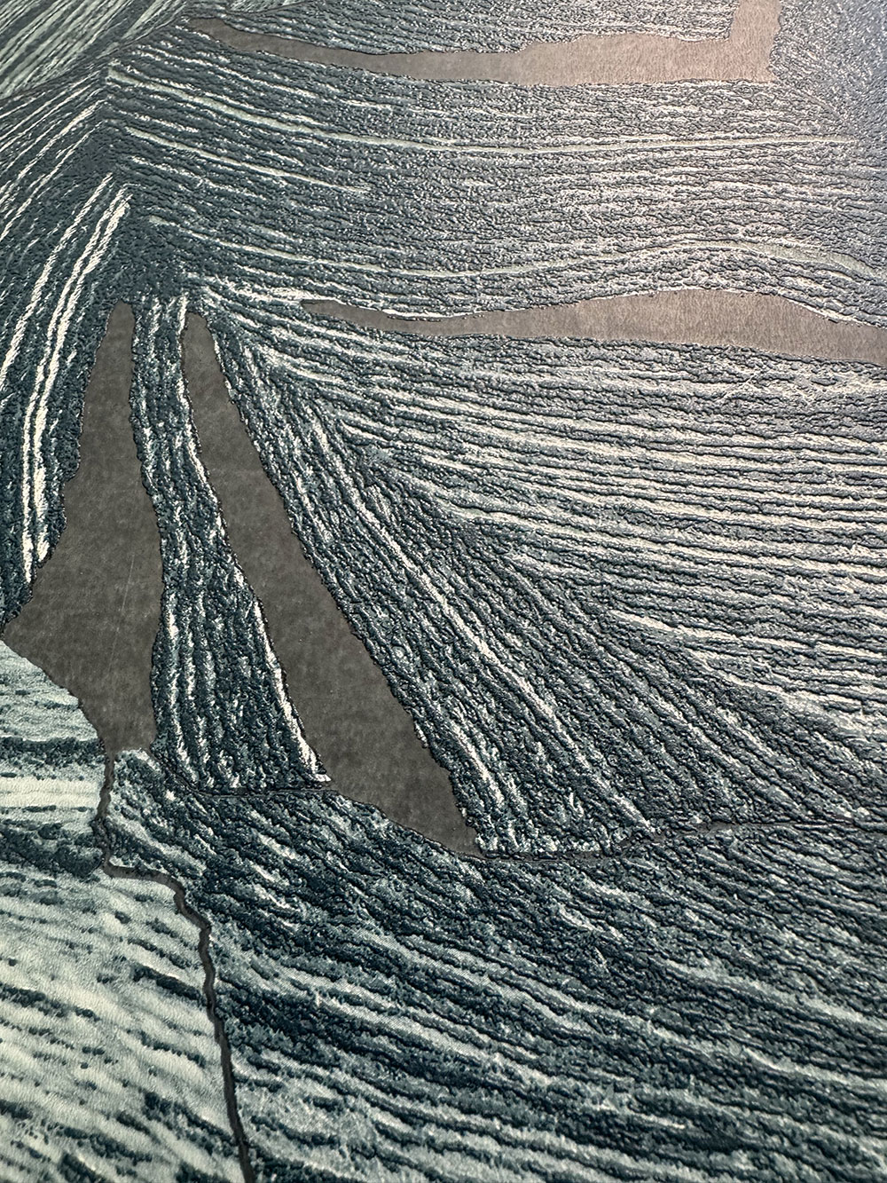 Embossed non-woven wallpaper, leaves in shades of blue / blue-green. Interior photo is for illustration only - different colours.