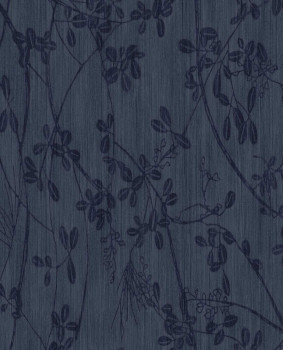 Gently embossed dark blue non-woven wallpaper with vinyl surface, motifs of twigs and leaves. Interior photo is for illustration only - different colours.