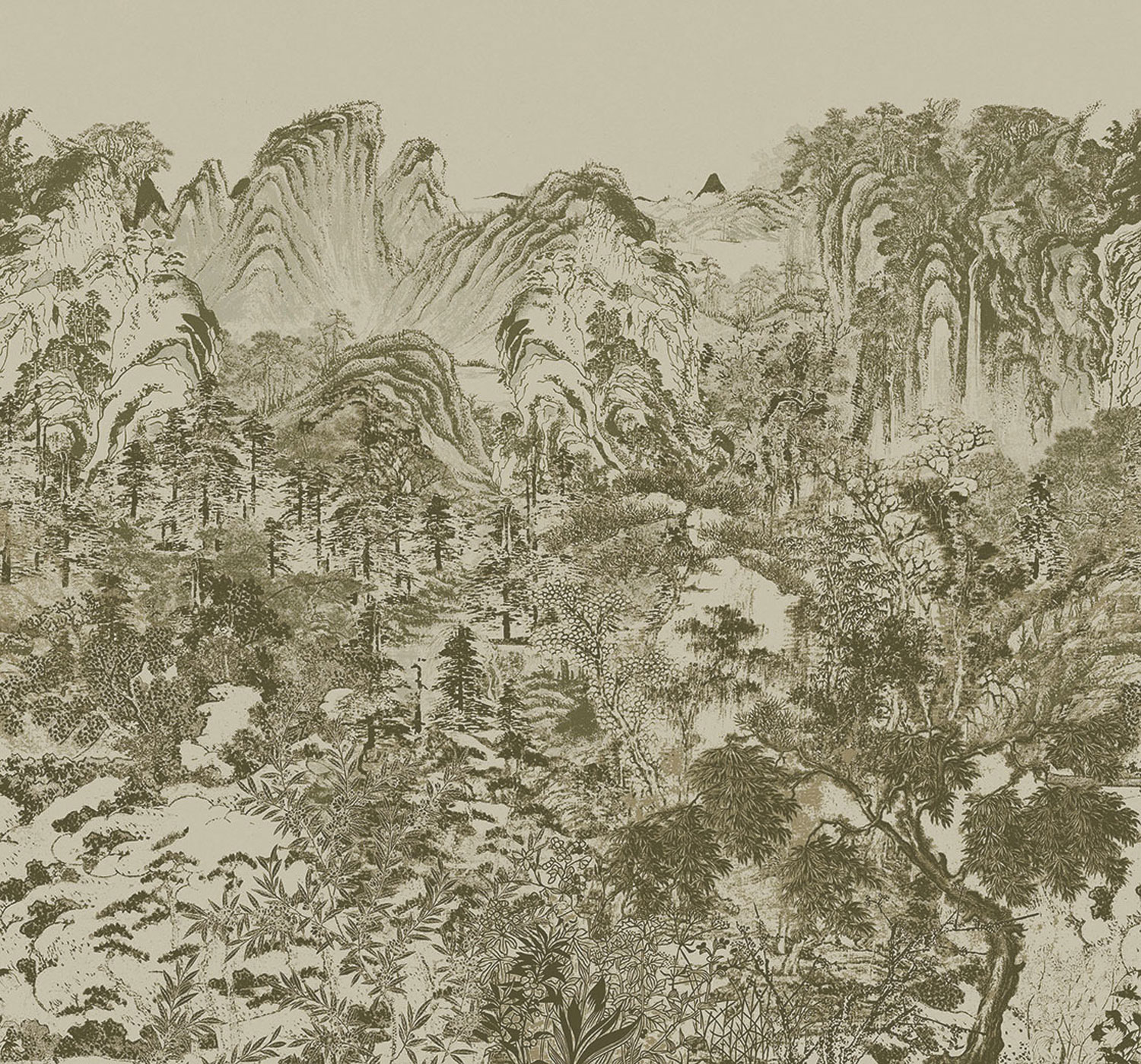 Non-woven wall mural in shades of green, mountain landscape motif. 300x280cm ( 4 panels ) The wall mural has a continuous pattern, for a larger width you just need to buy another piece. Interior photo is for illustration only - different colours.