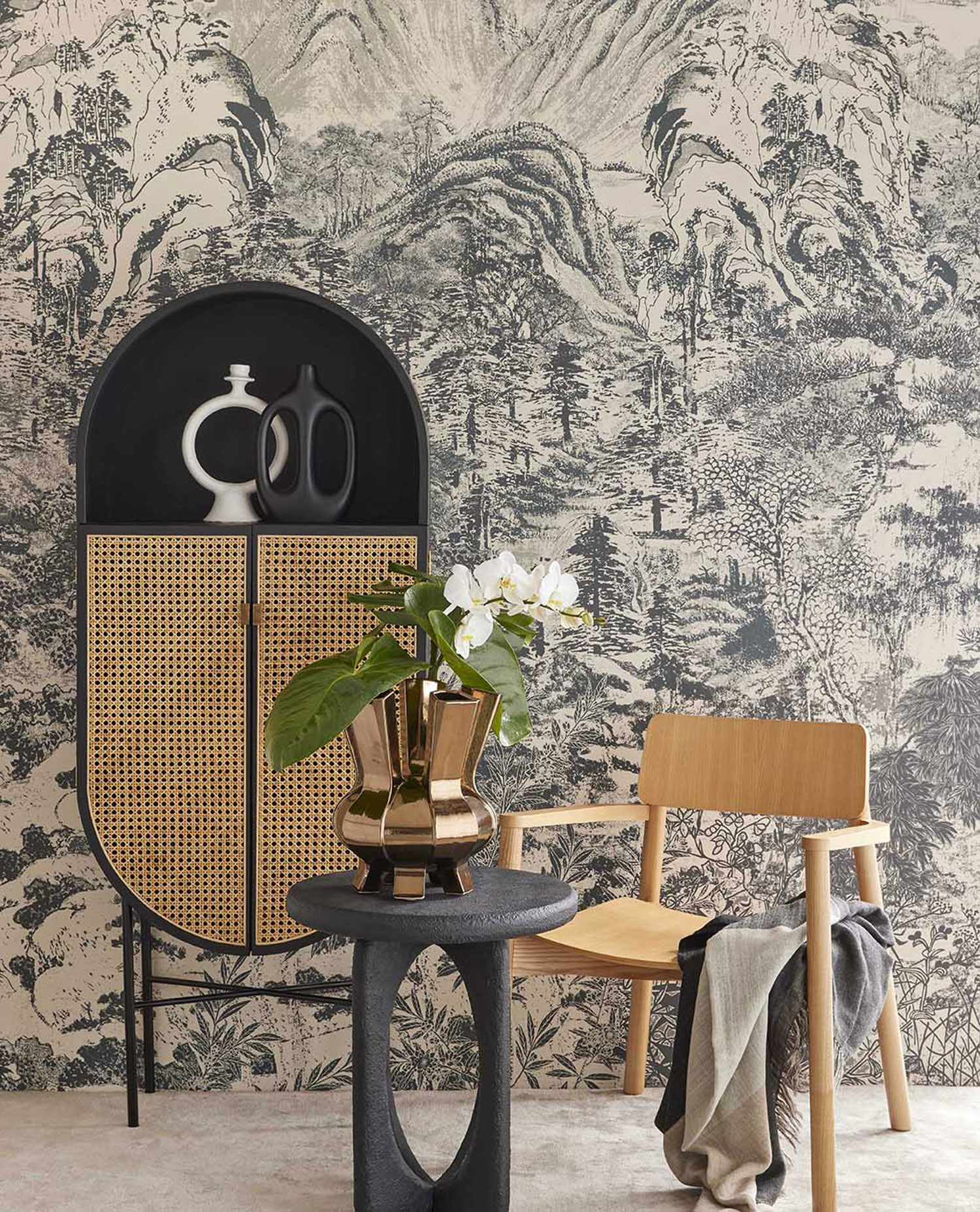 Wallpapers with serene silhouettes of tropical branches and exotic blossoms, bathed in a veil of filtered light. Or discover the natural structure of fine, woven bamboo. A bold floral motif on rough canvas, the rustic pattern of textured blocks with a hint of sheen or the distinctive ikat motif will transform your walls into a feast for the eye.