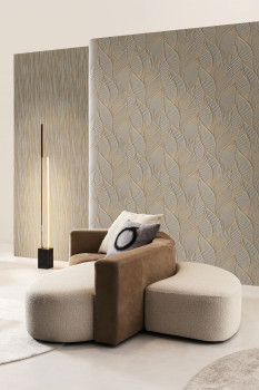 Luxury non-woven wallpaper with vinyl surface, brown-gold and silver reflections, embossed fabric texture.