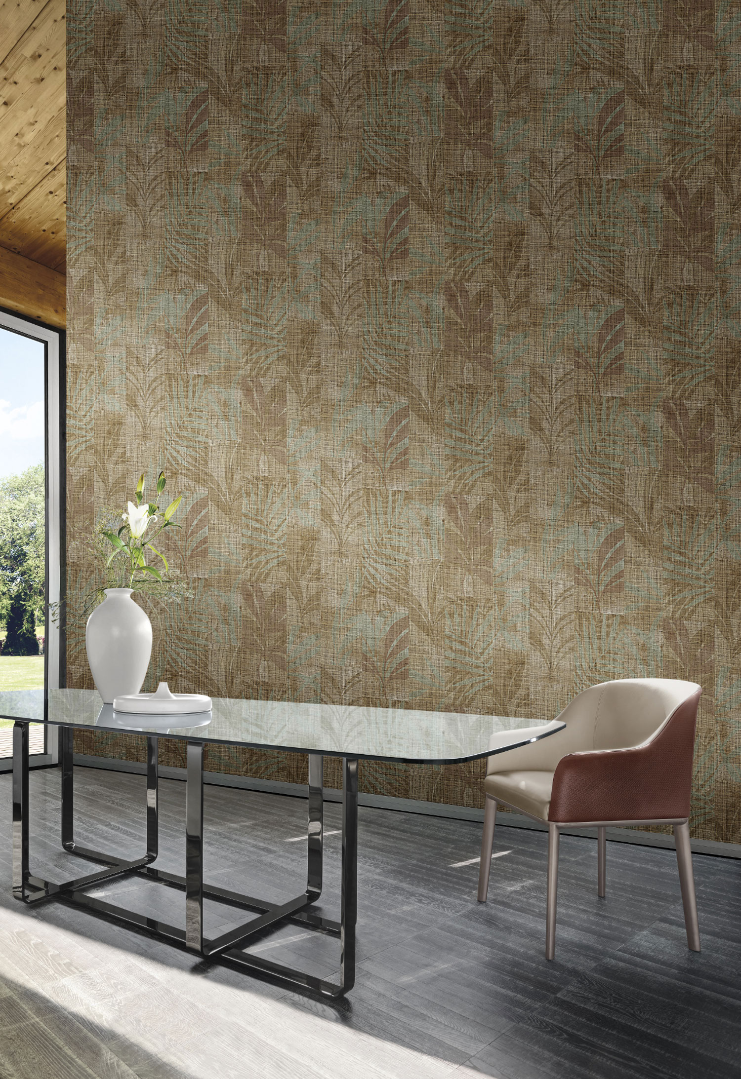 Luxury non-woven wallpaper with vinyl surface, embossed leaf motifs in shades of semi-gloss brown, brown-gold and green, coarser fabric texture.