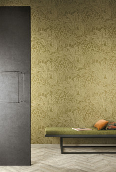 Olive green, embossed non-woven wallpaper, motifs of leaves - semi-gloss and matte effect.