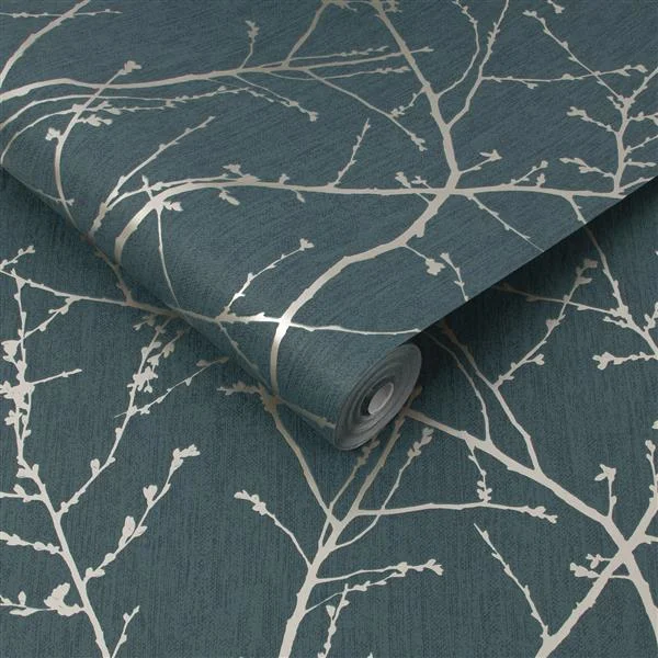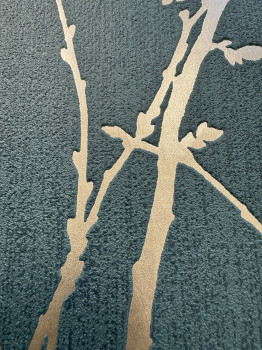 Green embossed non-woven wallpaper, fabric texture, smooth metallic branches, light gold.