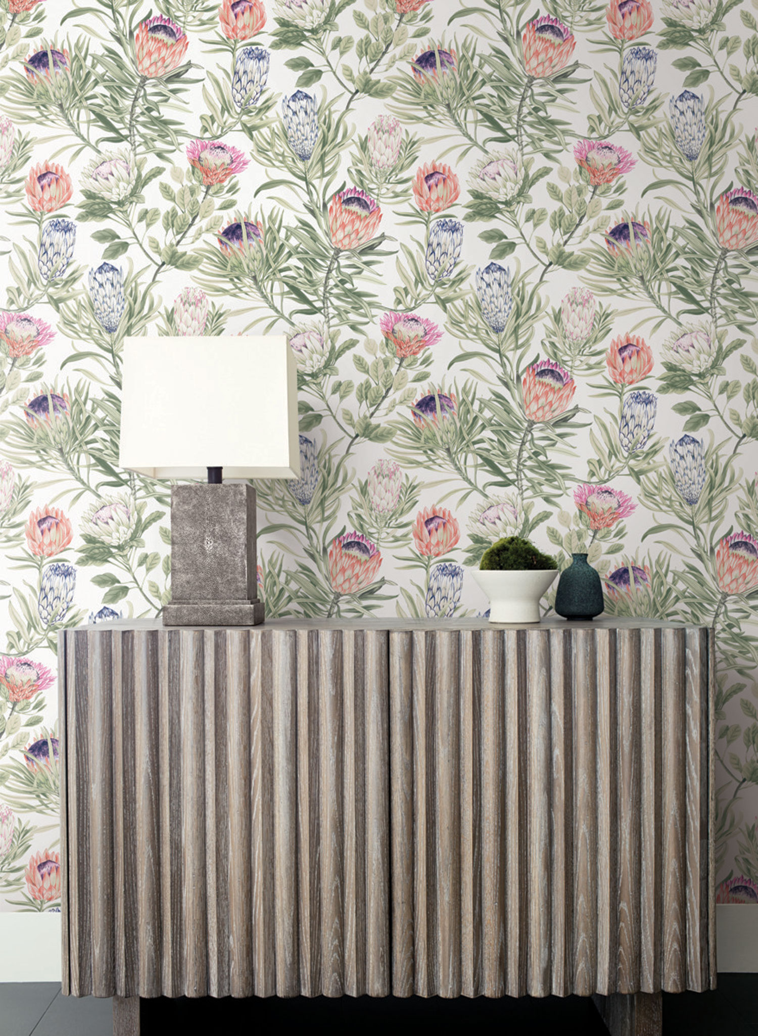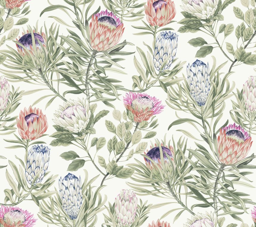 White non-woven wallpaper, exotic Protea flower motif in shades of green, blue, red and beige.