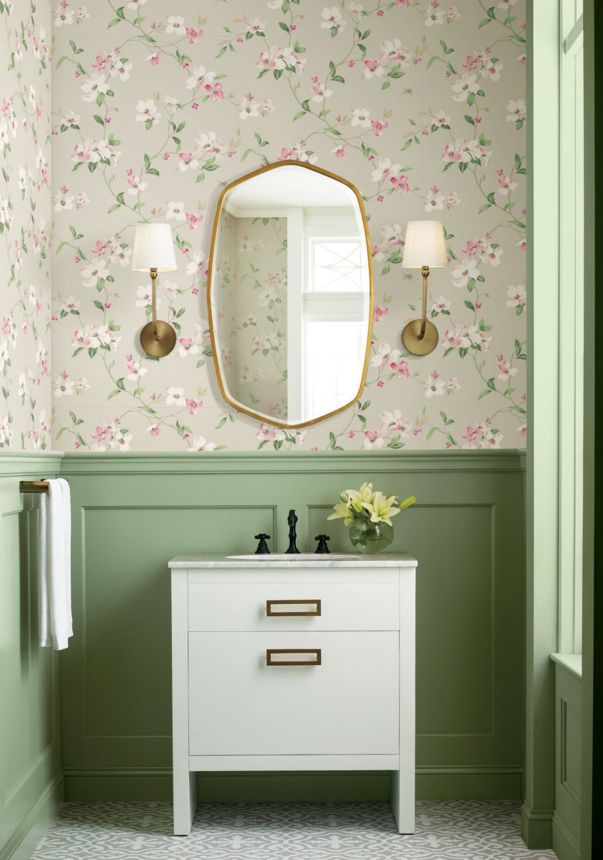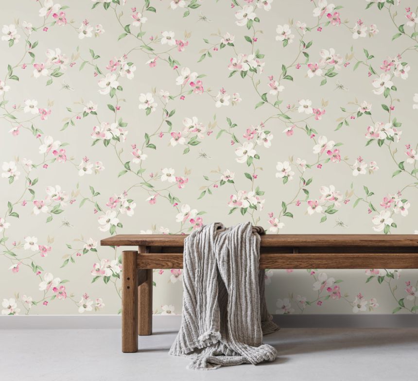 Beige non-woven wallpaper, delicately embossed dogwood flowers in shades of pink, white, beige and green.