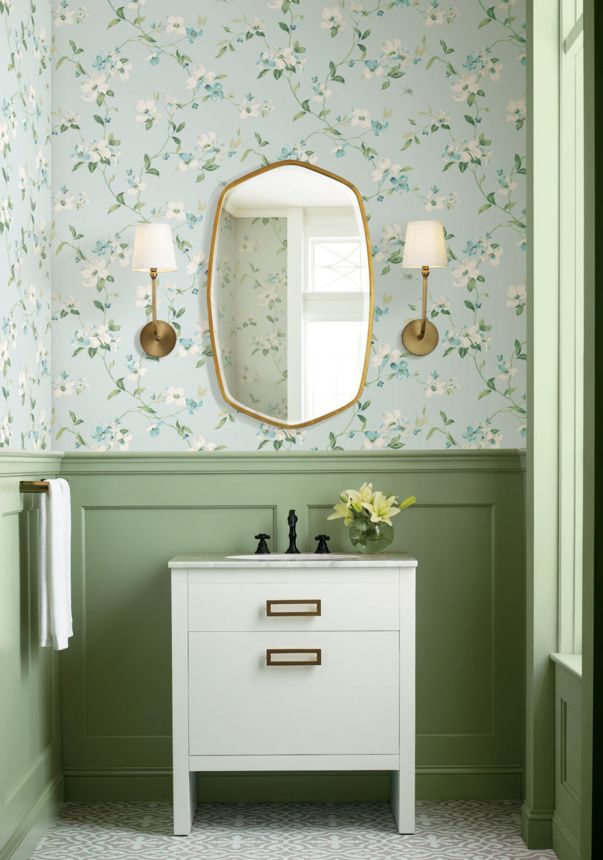 Light blue non-woven wallpaper, delicately embossed dogwood flowers in shades of white, beige, blue and green.