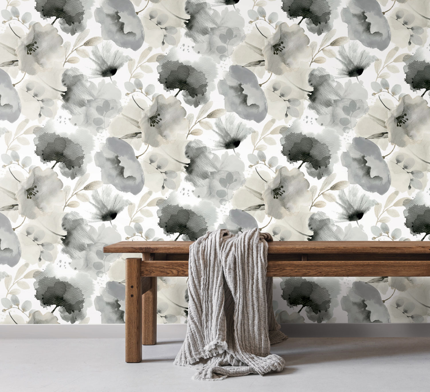 Gray-beige floral non-woven wallpaper, watercolor painting effect.