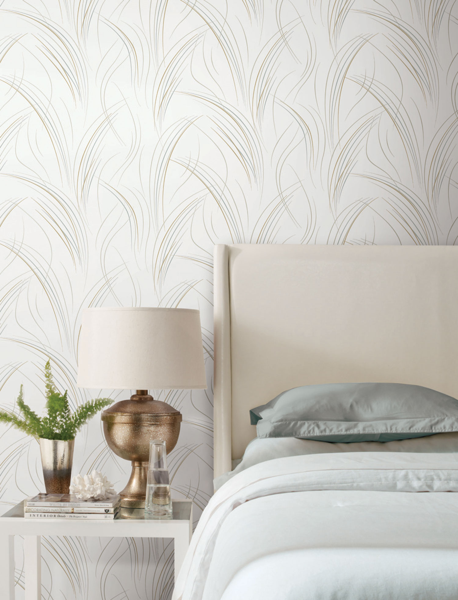White non-woven wallpaper, metallic beige, gold and silver lines.