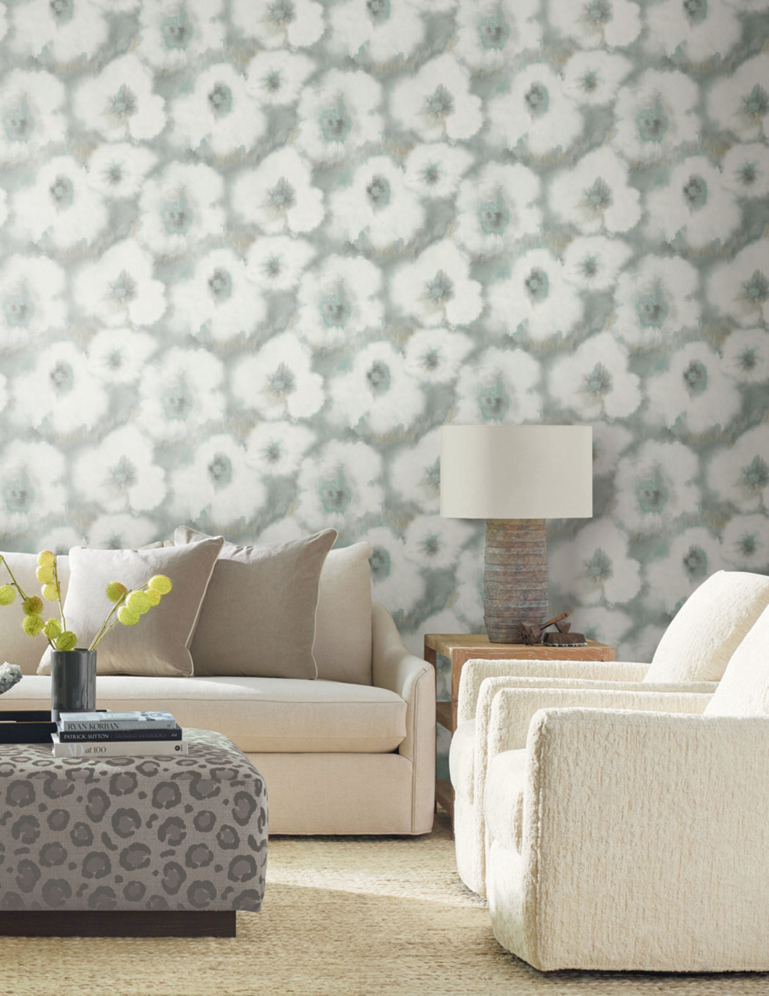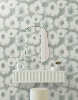 Gray-green floral non-woven wallpaper, watercolor painting effect on canvas.