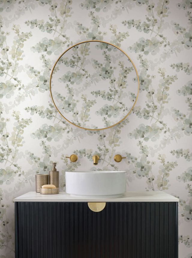 White non-woven wallpaper, floral pattern evokes watercolour painting, shades of gray, green and beige, metallic silver details.