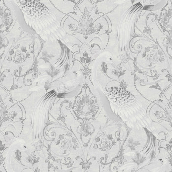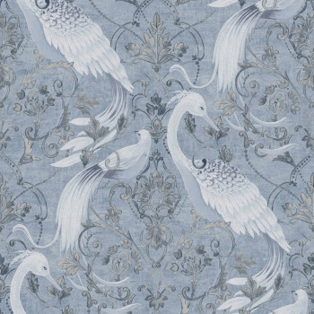 Blue non-woven wallpaper, motifs of birds and silver ornaments.