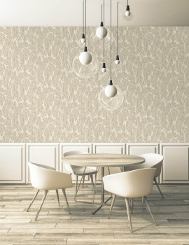 Luxury non-woven wallpaper in beige with a distinctive cream-colored marble pattern on a background imitating stucco plaster.