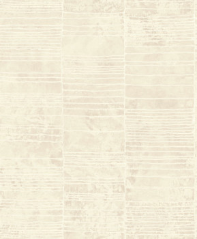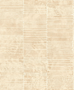 Luxury non-woven wallpaper in beige with an embossed gold geometric pattern on a background imitating stucco plaster.