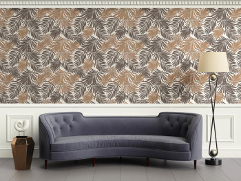 Luxury non-woven wallpaper with vinyl surface, motifs of leaves in shades of gold and gray-gold on a gray-beige background.