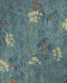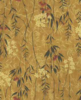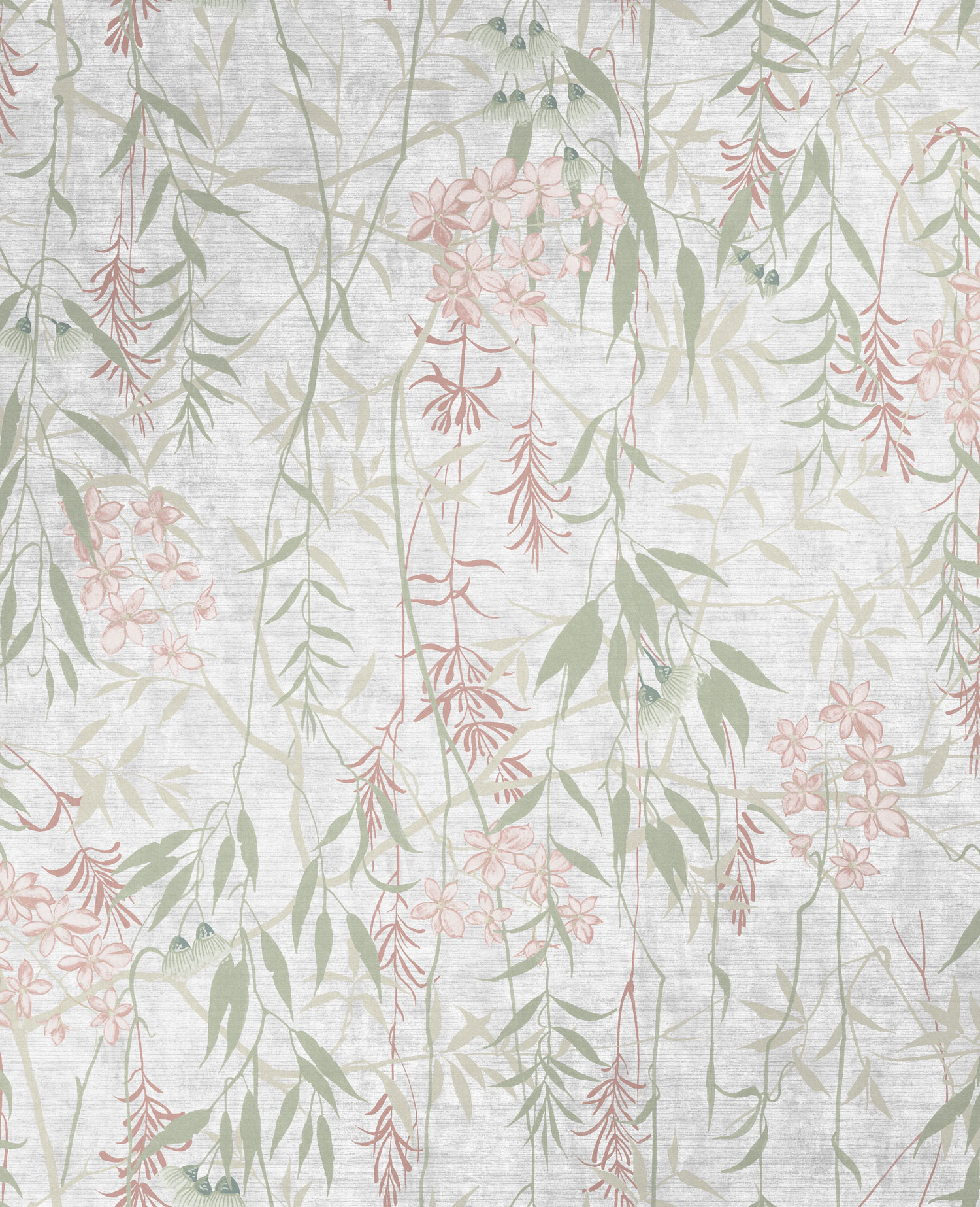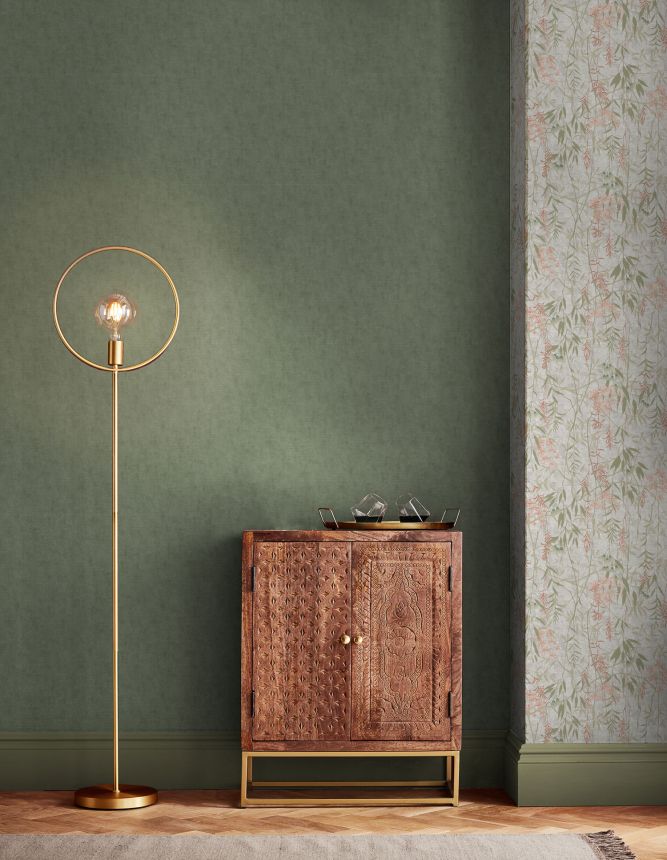 Semi-gloss beige non-woven wallpaper, flowers and leaves in shades of green and pink.