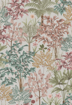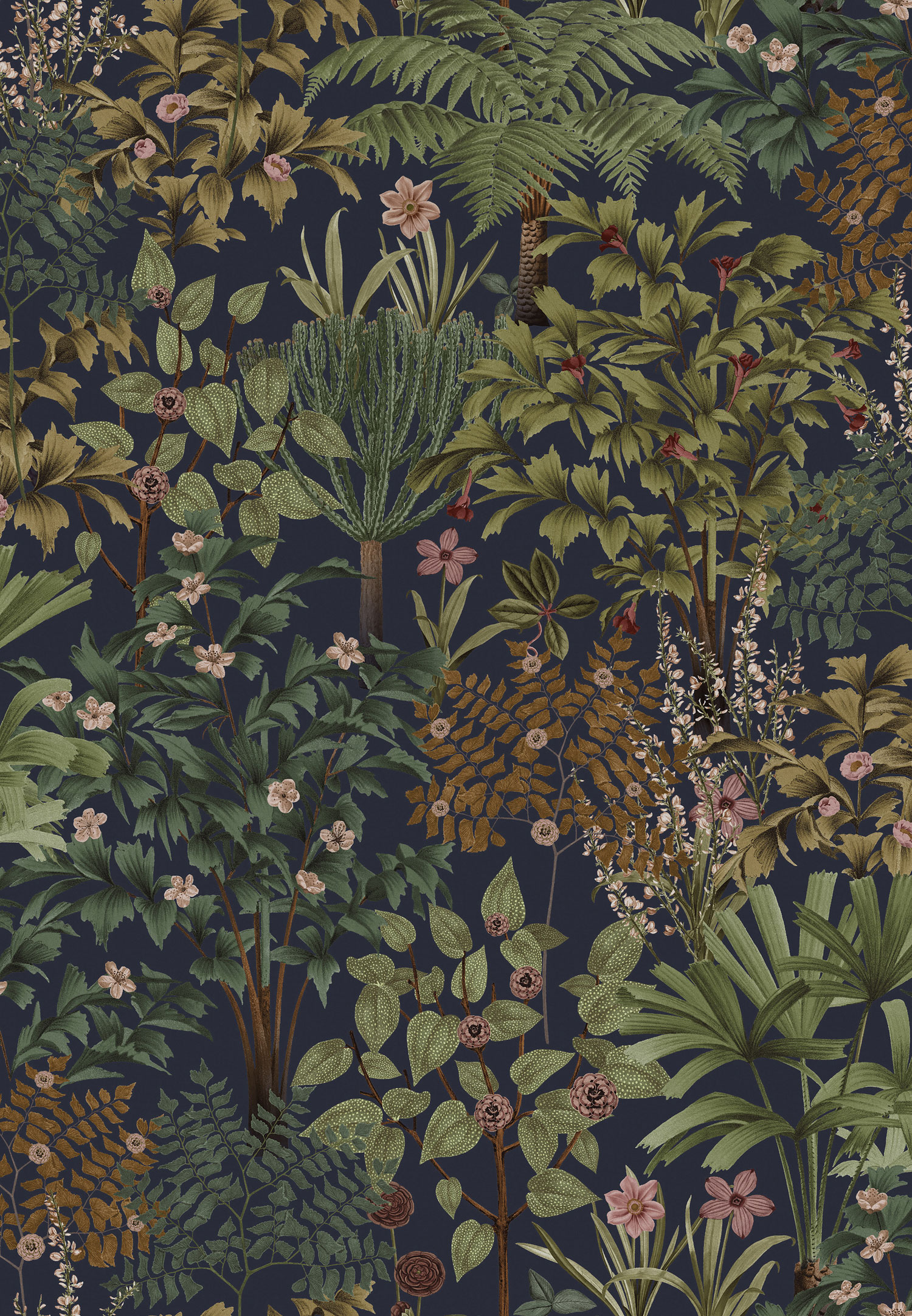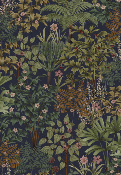 Dark blue non-woven wallpaper, floral pattern in green, pale pink, brown and ochre.